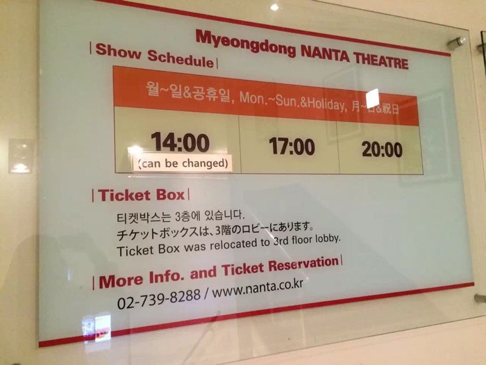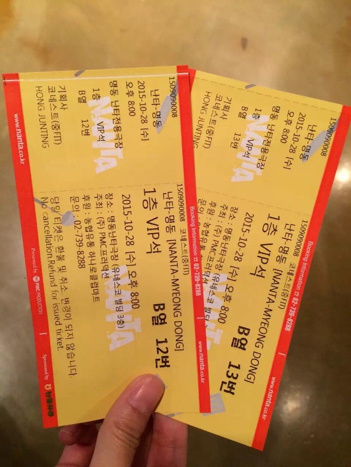 明洞有名的乱打秀… 事先在网上预订了乱打秀的门票,由于表演过程是不能拍照录像的,就随意拍几张照片留个纪念,我们是vip的票票哦~ 哦呦~整个节目从头笑到尾,非常精彩~ 爬松~~~值得一看~
