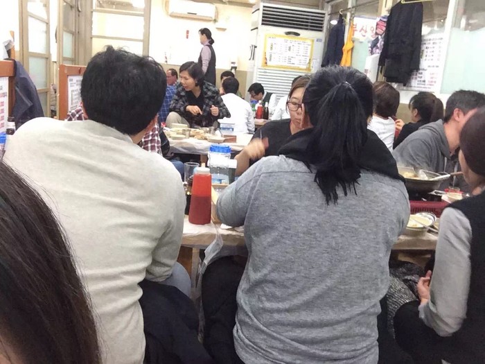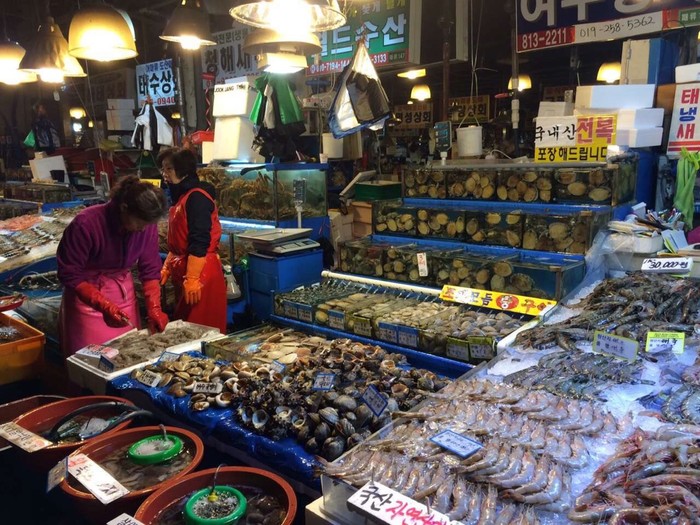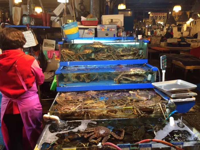本来计划今天吃好海鲜大餐后去汉江看彩虹喷泉的没想到一出酒店就开始变天了 只能换行程了。冲着帝王蟹特意来鹭梁津海鲜水产市场的,坐等着海鲜上桌~