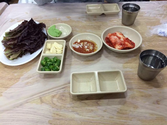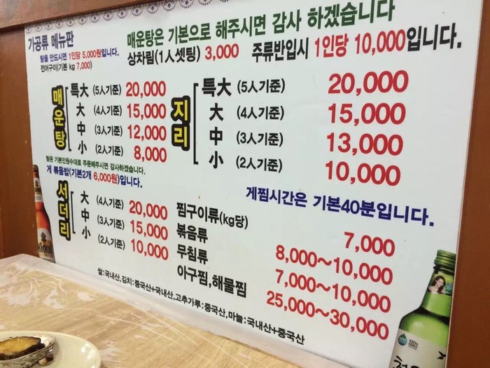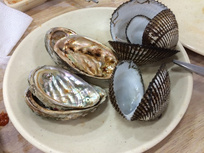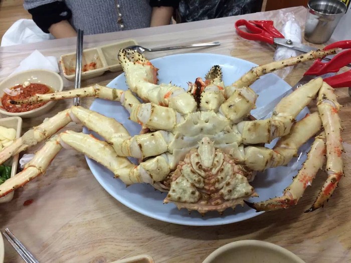 使出了浑身解数和老板讨价还价,称分量下来64000韩元的帝王蟹58000韩元下手了,10000韩元4只鲍鱼再多送了3只大毛蚶,赞赞~ 外加饭店制作费合下来差不多人均250元人民币,是我们行程中最最最贵的一顿了~
