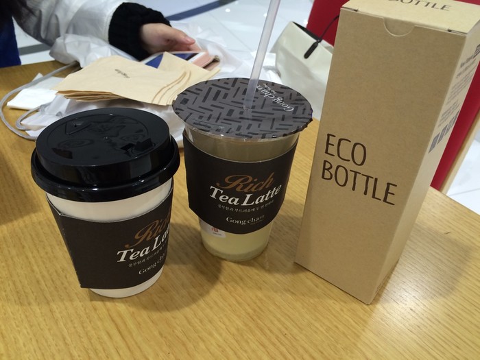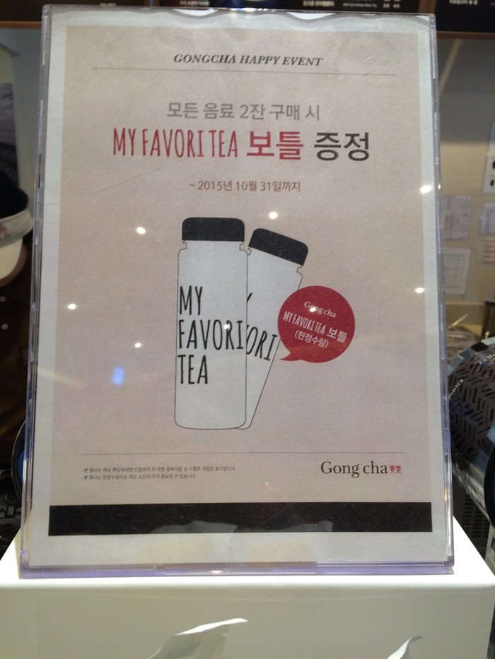 后面实在是冷死了,去附近买了热饮暖和暖和(开在韩国的贡茶),碰巧撞到买两杯饮料送杯子活动(正好碰到我这个杯子控,好开心呀),然后坐在里面,一边喝着饮料一边把剩下的炸鸡解决掉了