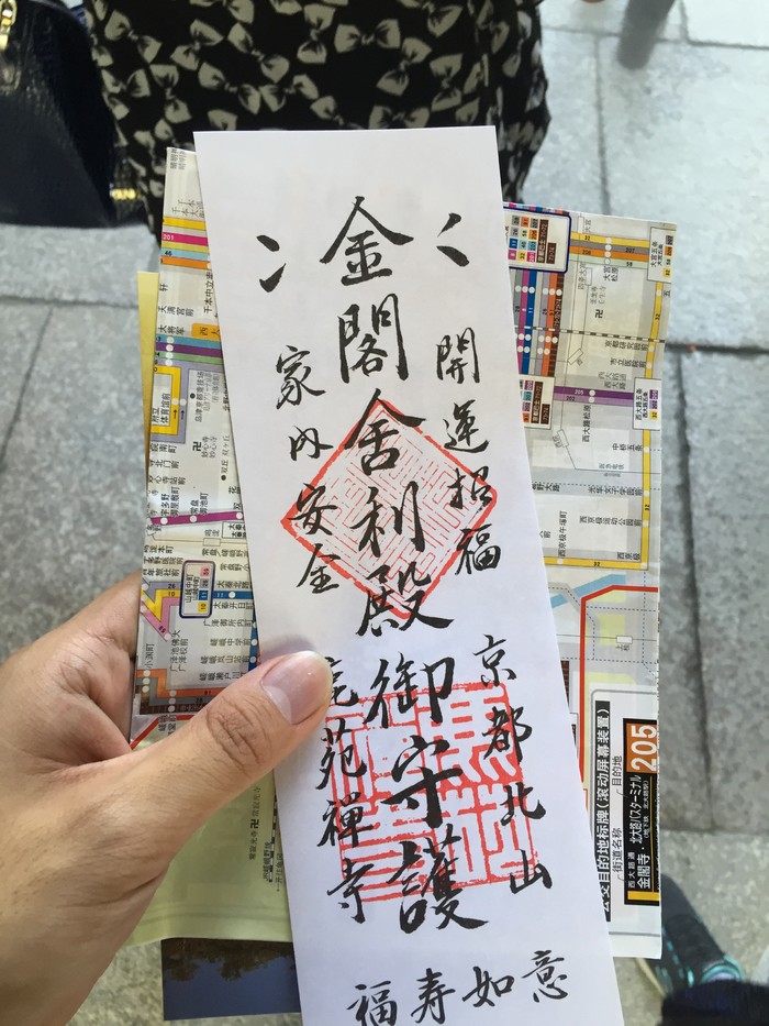 金阁寺出门的地方可以换到御朱印,这边着重讲御朱印,在日本的神社基本都能拿到御朱印,这次旅行结束,估计自己拿到了十几张左右,300yen一张,建议在第一个到的神社想购买御朱印的地方买本小本,以后每到一地方,让他们可以直接在小本上写,我刚开始没买小本,就直接买一张写好的纸,后来集多了,就发现还是应该写在小本上。