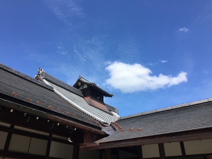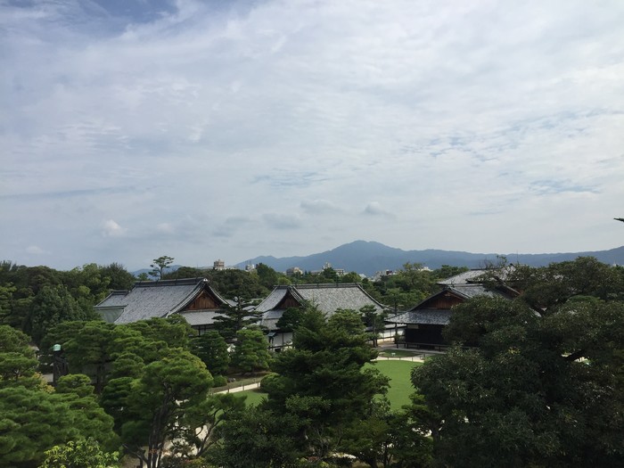 二条城最高处,曾经角楼遗址的高台,可以看见周围房子的屋顶,以及环绕京都的山,晴天尤其是万里无云的时候特别美。