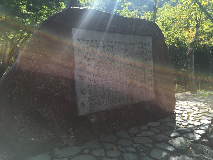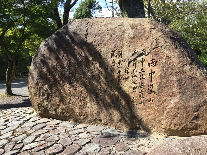 竹林尽头左边往山下走就是岚山公园,岚山公园有很多碑刻,眼睛看花了也没找到周总理的碑刻。当时就是为了冲周总理的雨中岚山才来的岚山啊,一直走到山下了还没看见,百度谷歌高德地图位置也都找不到,以为错过了,还失落好一阵子,结果发现就在下山的路边,路边还会有块牌子指着里面走就是雨中岚山碑。哈哈哈。