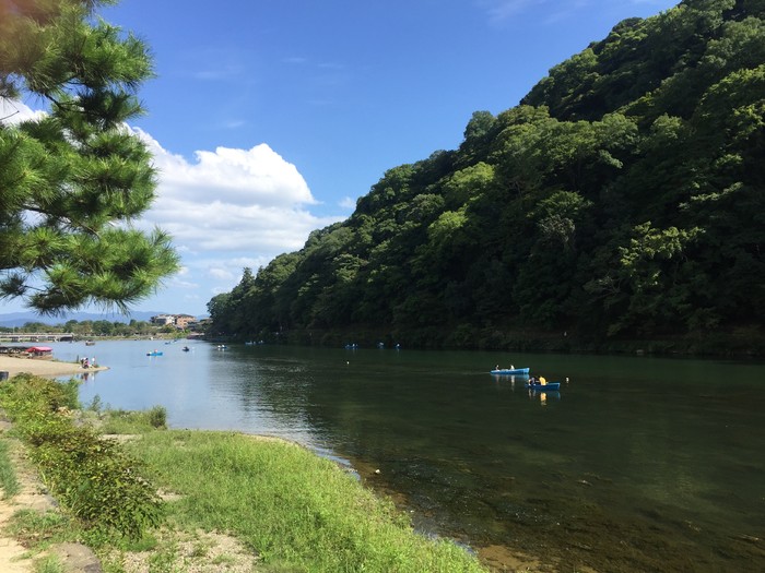 出岚山公园沿着河往前走就是渡月桥。好多小船~天气特别好