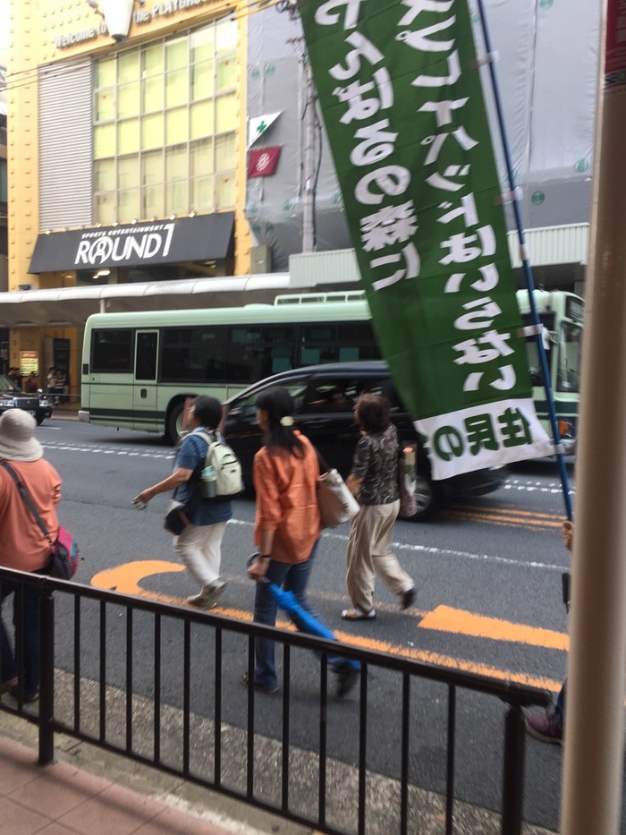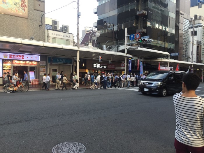 休息完晚上去鸭川边上找吃的,沿着去三条大桥路上,看见日本的反美游行,大概两百人左右,反对美军基地啥的,这边拍了下游行队伍的尾巴~