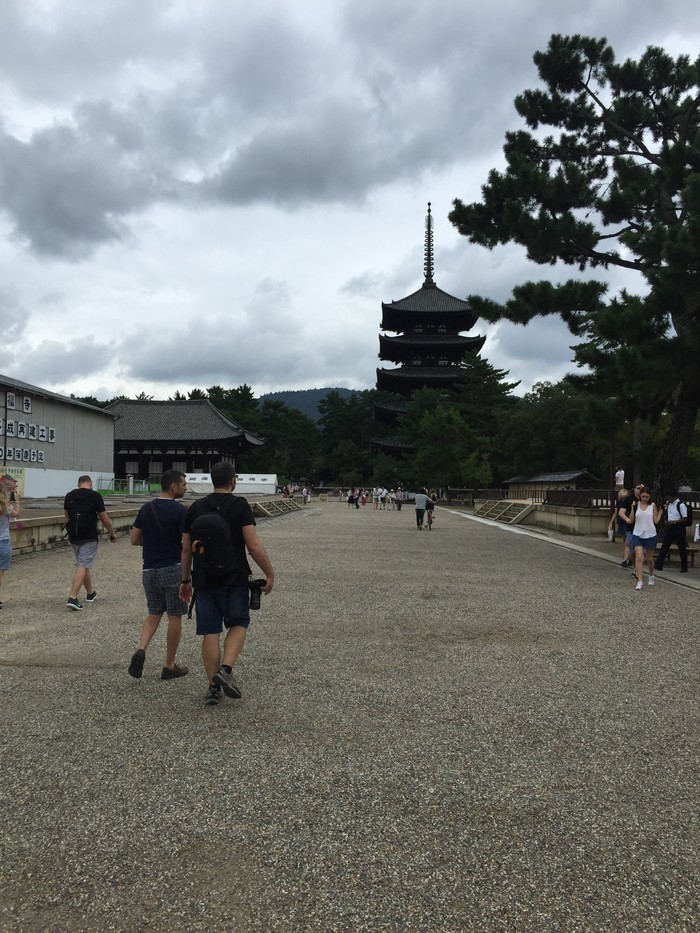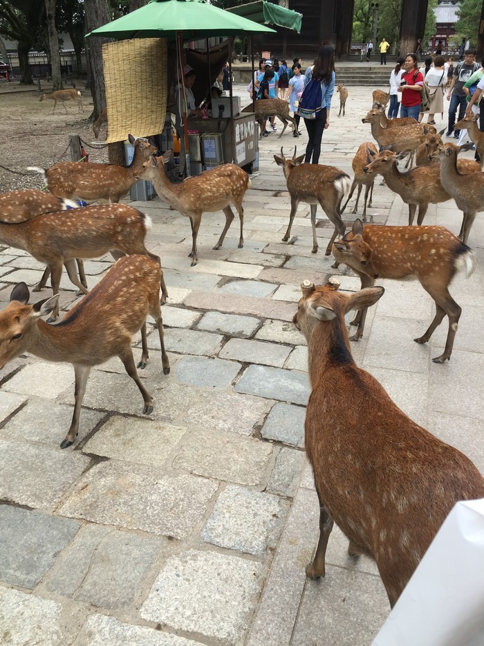 出奈良公园的时候,看见还有外国友人在公园门口摊子边上举着鹿饼被鹿角爆了菊花,旁边一群人在笑。