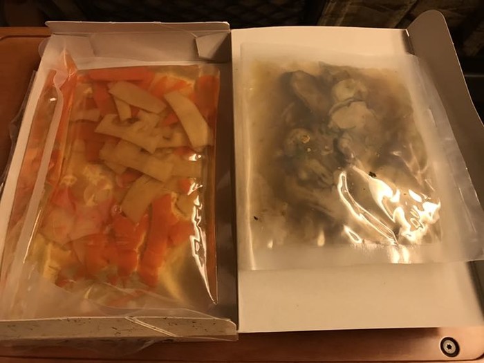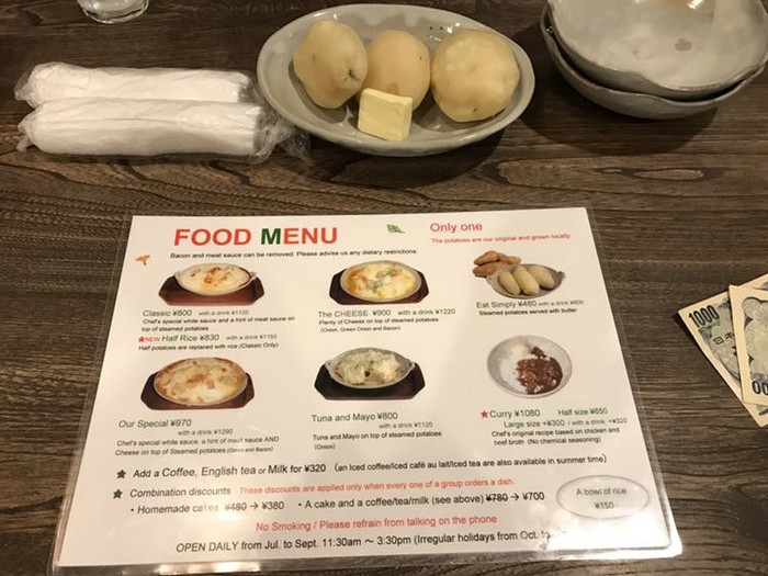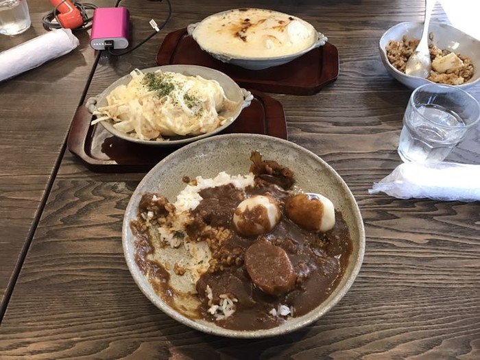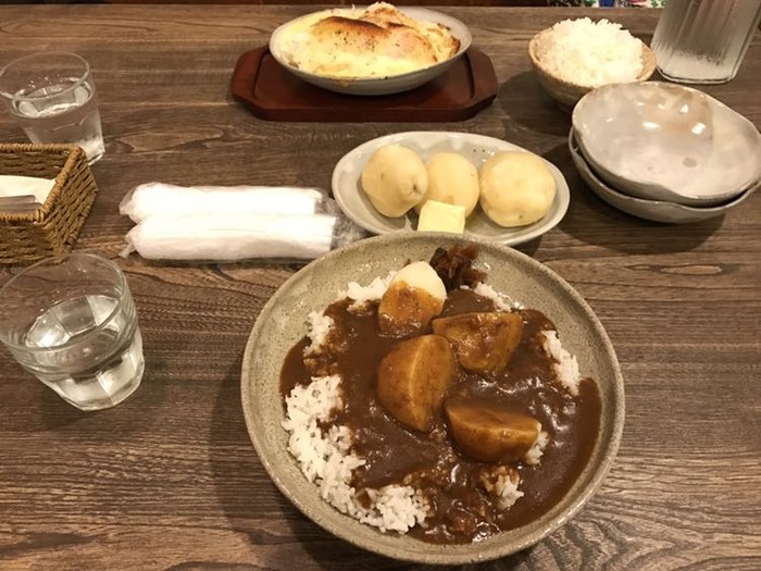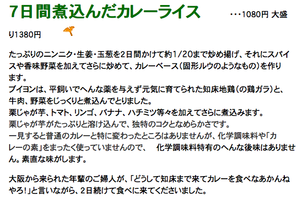 怪不得做出来的咖喱饭这么好吃。把上面的文字用百度大致翻译了一下,是说完全没有使用化学调味料(应该是说化工合成的那种吧比如味精),是用大蒜、洋葱、生姜熬制两天的样子,加入调味品和香味蔬菜和咖喱基础,白汤使用了未使用疫苗等药的土鸡和牛肉,再加入蔬菜炖,同时还有栗子、土豆、番茄、苹果、香蕉、蜂蜜等一起熬制。下次有机会去知床一定要去老板娘那里偷师学点料理回去,现在每天只想着吃老板娘做的咖喱饭。