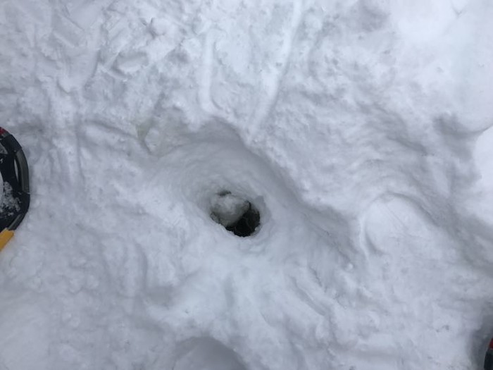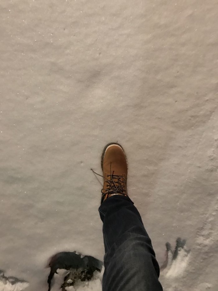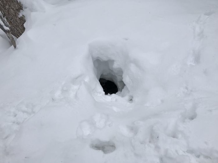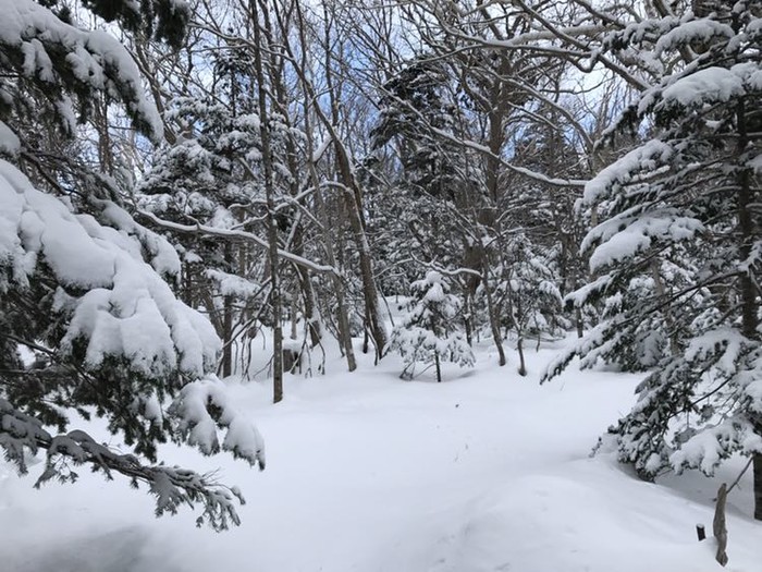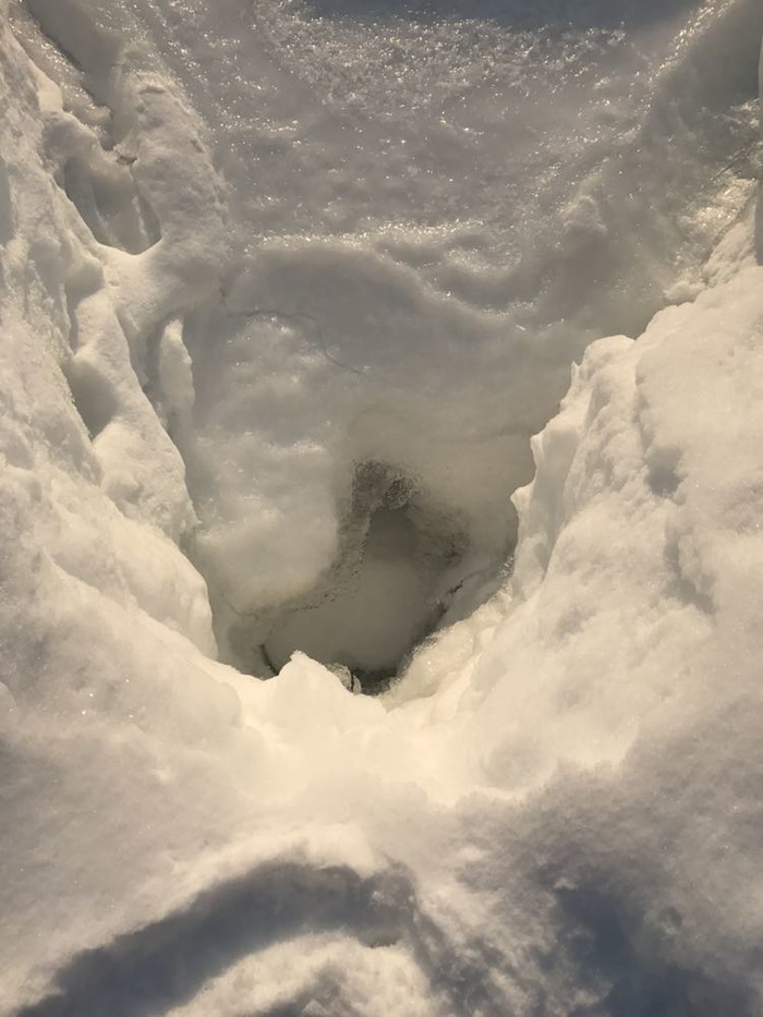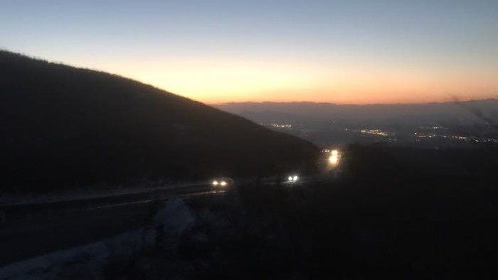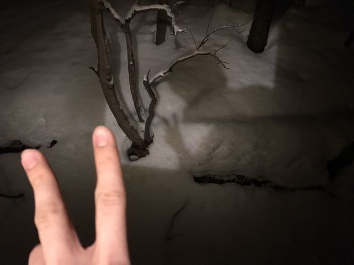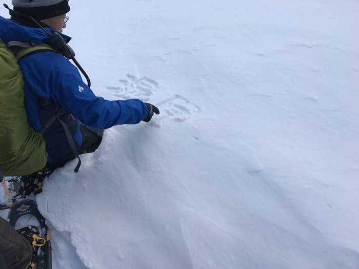 前面那个大概就是我疾速下滑的地方,看着还好实际上超级陡了而且地上不是很平。等了好久没有看到旅伴,就把滑板从雪靴上脱下来,扛着滑板爬上山,在前方坡道中央看到了人,发现旅伴已经没多少力气了(我的锅,早上7点吃的早餐,到晚上6点我们才吃当日第二顿,身上早没劲了),等 Jerry爬上山,身上也是虚的了。