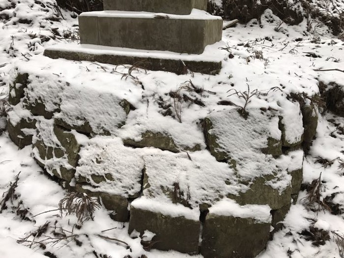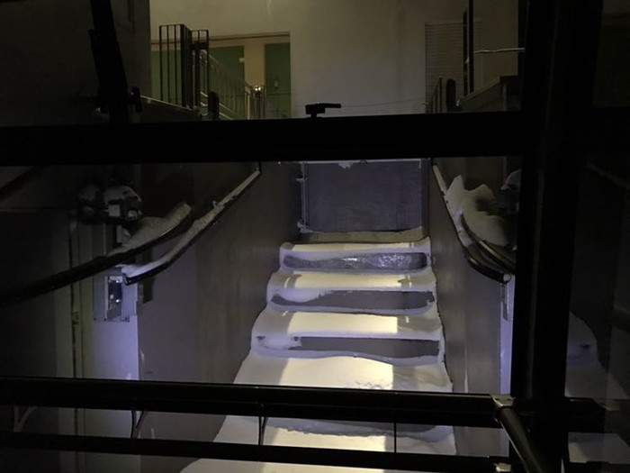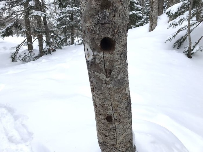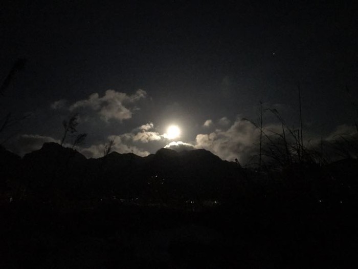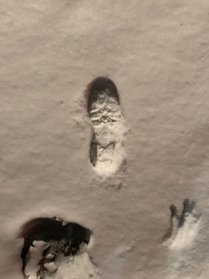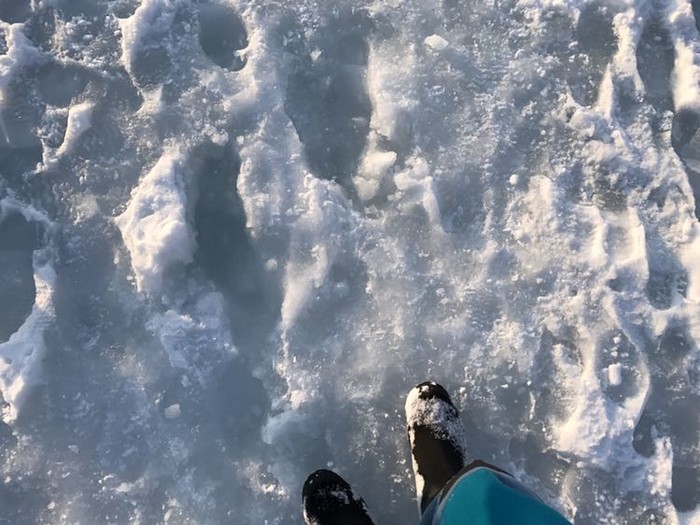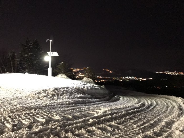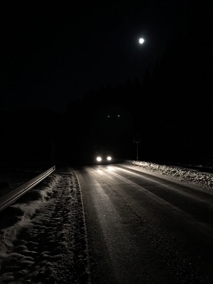 前面那个大概就是我疾速下滑的地方,看着还好实际上超级陡了而且地上不是很平。等了好久没有看到旅伴,就把滑板从雪靴上脱下来,扛着滑板爬上山,在前方坡道中央看到了人,发现旅伴已经没多少力气了(我的锅,早上7点吃的早餐,到晚上6点我们才吃当日第二顿,身上早没劲了),等 Jerry爬上山,身上也是虚的了。