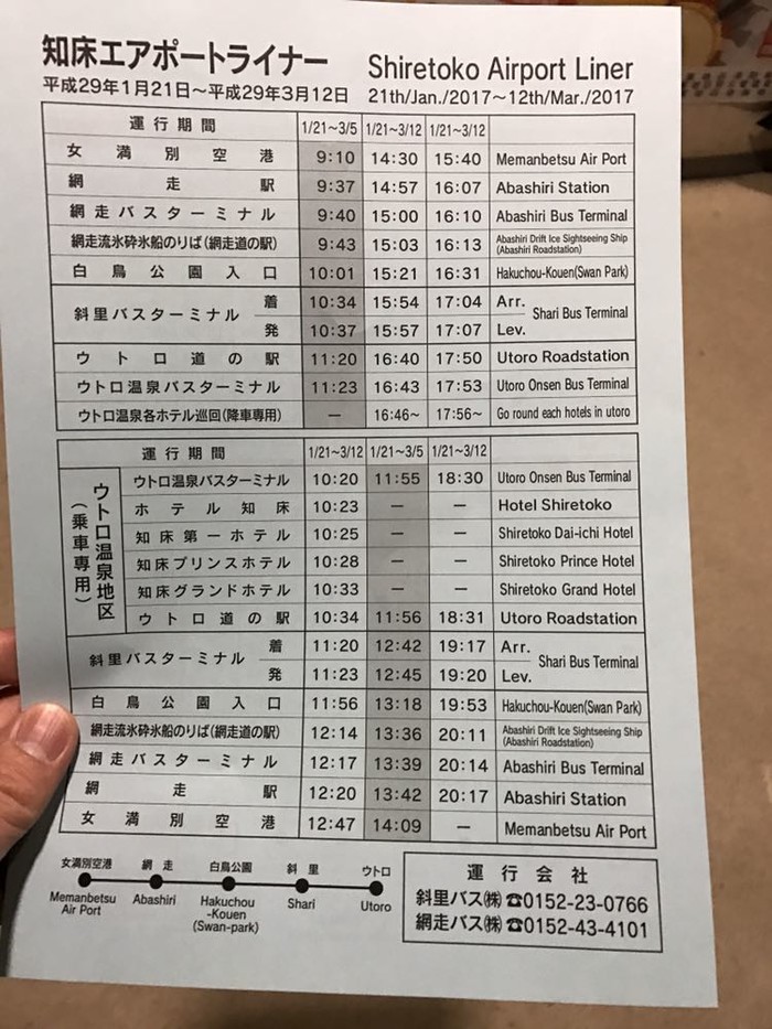7:50参加知床协会的五湖漫步和流冰,下晚上18:30乘巴士前往知床斜里19:17,21:12乘JR前往网走站21:53。