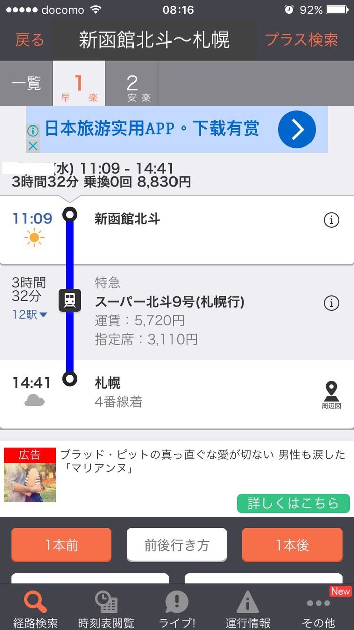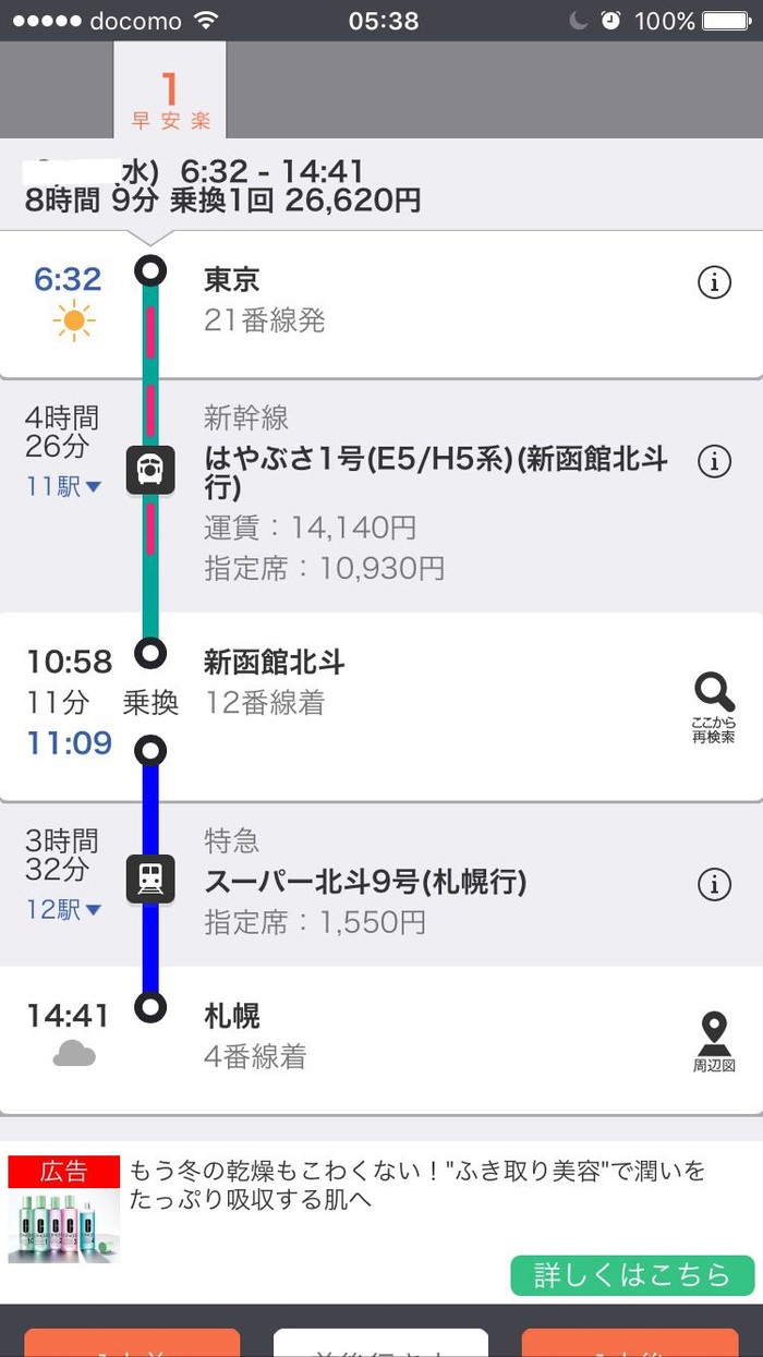 感觉新干线比飞机还是舒服的,虽然走的早,但是你可以一直在车上睡觉,而且新干线东京到新函馆北斗一趟差不多就把7日的pass回本了。对了,乘换案内上多程的票价是不准的,最好把各个区间分别搜索来查票价,东京到新函馆北斗的票价是11560+10930(运资+指定席),这趟车是全车指定席的,最好早点去车站换票,当然凭pass也能上,车上也没有人查你的票(这麽多天发现只有特急的指定席是有人查票的,其他车包括新干线都没有人查你的票),但是没划座位的话很可能一路就是没有空位站着去了。