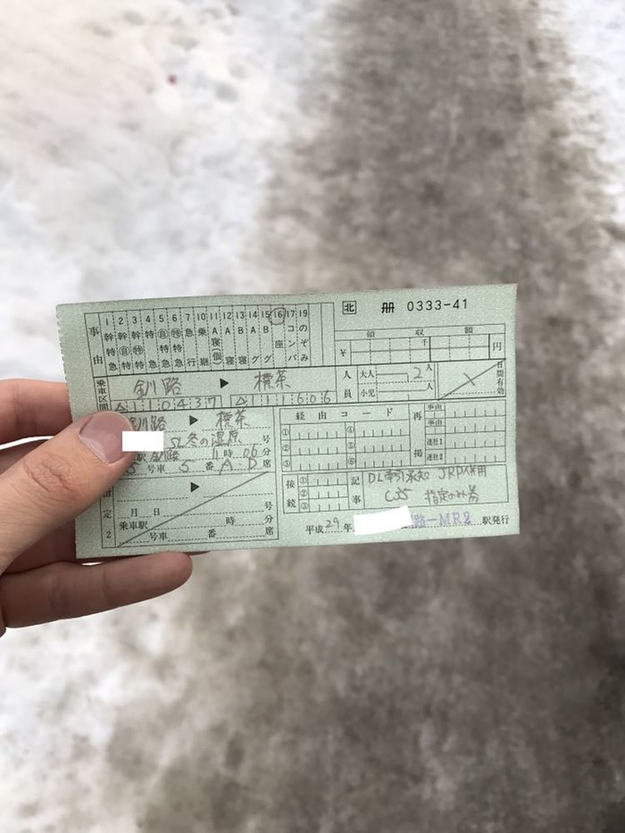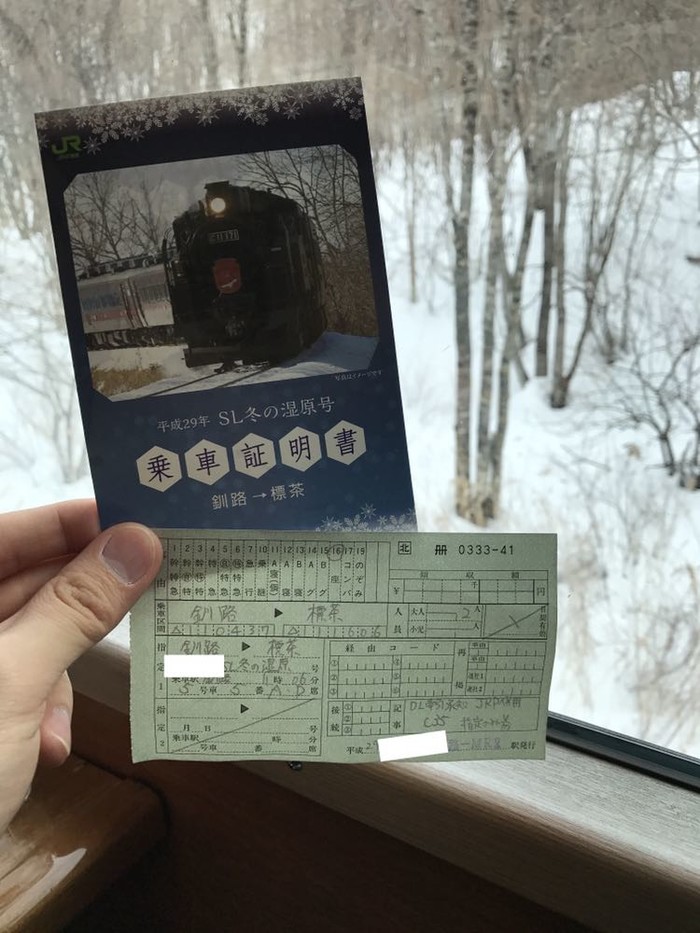 我先去釧路站换了今天冬季湿原号的车票(本来是蒸汽车头SL号的结果蒸汽车头临时故障差不多一个月都使用的DL号柴油车头,不过车厢还是SL号的了)。就如前文所言的,Jerry当时担心座位被抢光,就现在北海道 JR日文官网根据网上的教程预定了靠窗的座位(因为用JR Pass只能现场到窗口预定座位,不能通过网络预定),用信用卡预定;这天早上因为我出示了JR Pass,desk clerk先是刷了信用卡确定订单,然后打电话给Ticket Center把钱又refund回了信用卡里面,最后给我们划了座位,手写的票诚意满满,而且感觉她们的这种服务真的是很人性化呀,因为我本来已经做好了交钱的准备,最后她们还给我免了单,感动。