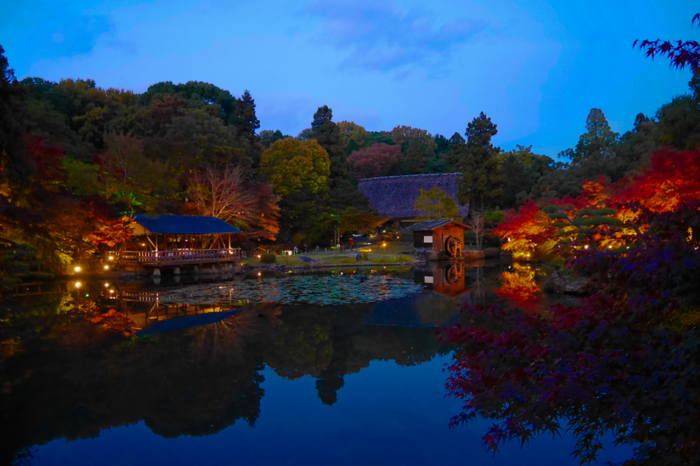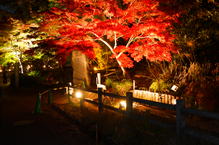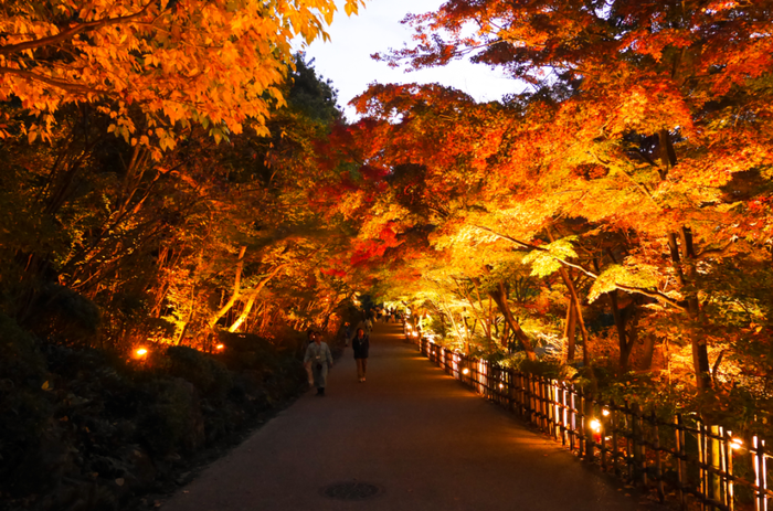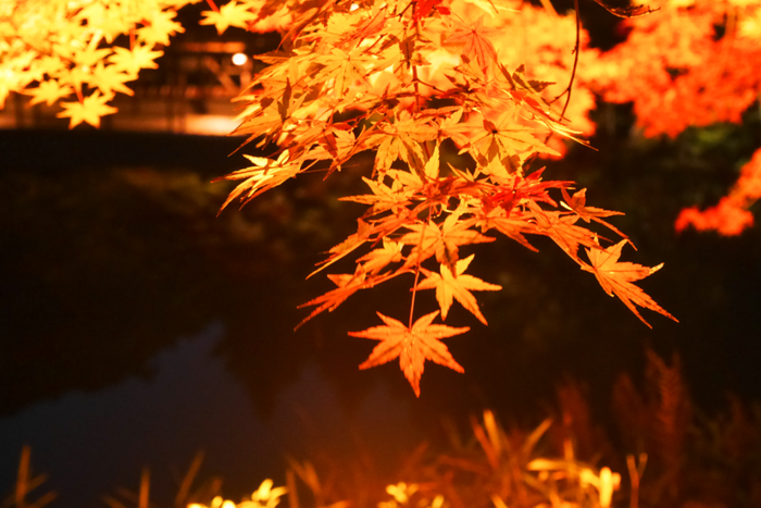 ↑ 在灯光的照耀下,红叶好像有了新的生命力。非常的华丽而耀眼,夜晚赏红叶果然更加浪漫呢。