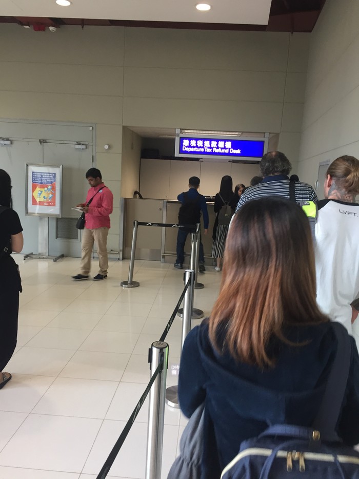 中心一楼有很多自动取票机,通过扫描二维码领取船票,然后去二楼排队check-in跟办理行李直挂手续。登船后半小时到达香港机场码头,先别急着去机场航站楼,因为有一个香港机场离境税退税可以办理,凭离境税单领取,可以退120HKD。领完钱后乘坐免费接载旅客的捷运系统(APM)到机场航站楼T1,大概4分钟。