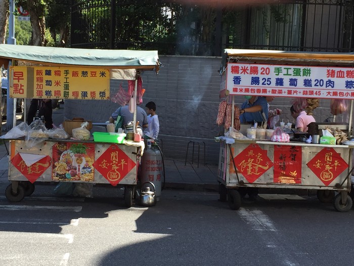 当清晨的第一缕阳光照进窗沿,我迷迷糊糊地醒了过来,眨了眨朦胧的双眼,习惯性的摸索着手机,看了会早间新闻,9点起床,9点半出门吃早餐。出了民宿的小巷,门口就有很多卖早餐的小推车,我走到了一家小推车前细细的打量着,大致都是蛋饼、豆浆、萝卜糕等。我点了一份蛋饼25T,一杯豆浆20T,一根大肠包小肠45T(全台最低价格),一共90T。