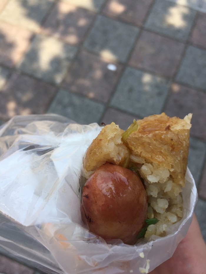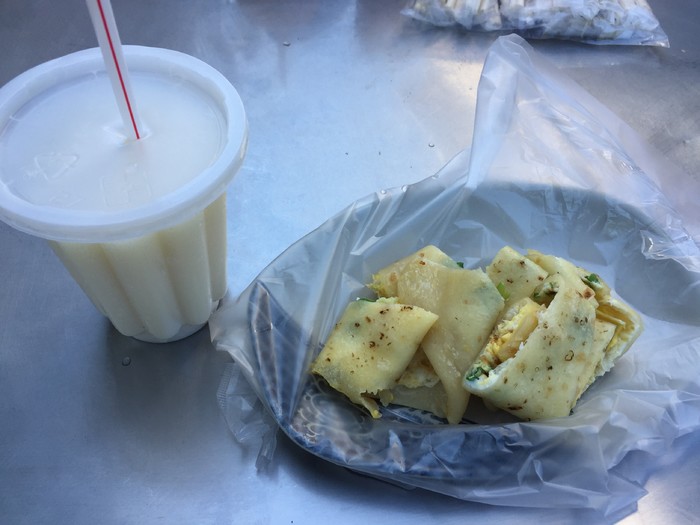 豆浆没有内地的好喝,没有什么豆味,感觉像饮料。蛋饼想当好吃,外酥里嫩,鸡蛋很香滑,里面还加了肉松。大肠包小肠外面是糯米肠里面是台式香肠,经过碳烤,阿婆将糯米场切开后涂抹酱料,添加各种配菜蒜头、花生粉、酸菜等,然后将体积较小的香肠包裹进去。颗粒饱满的米粒咬下去香糯十足,里面是香肠,丰富的口感,美味又独具特色,回味无穷!