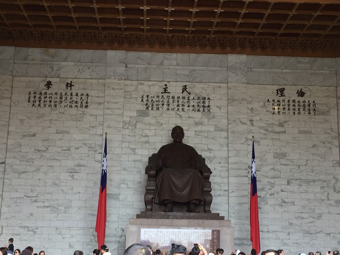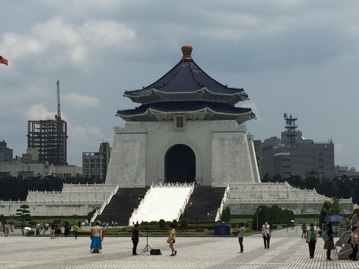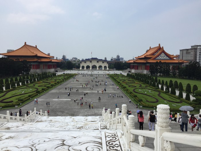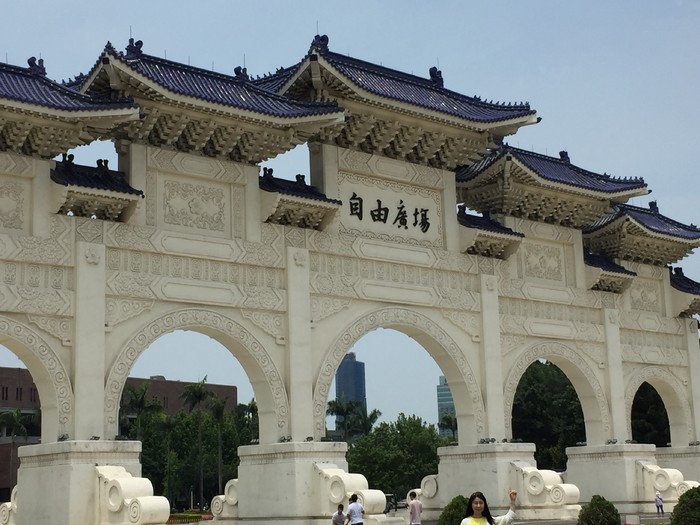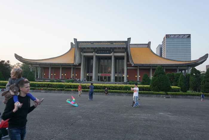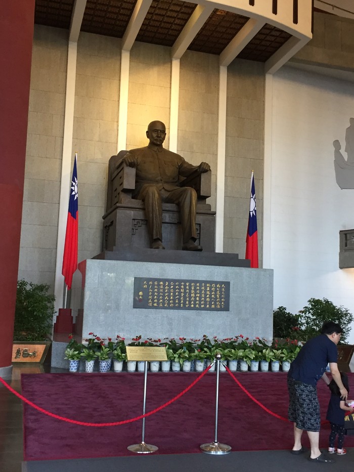 士林官邸出来后,然后去了中正纪念堂。中正纪念堂位于台北市中心,分别以杭州南路、中山南路、爱国东路、信义路的周界,全区包括中正纪念堂、中正纪念公园、牌楼、围捕、瞻仰大道、两侧为剧院及音乐厅,造型仿北京天坛之顶、埃及金字塔之体,高耸威严,全是中国宫殿式之建筑,有浓烈的文艺气息。捷运中正纪念堂站出口5。