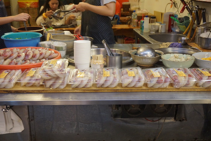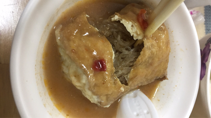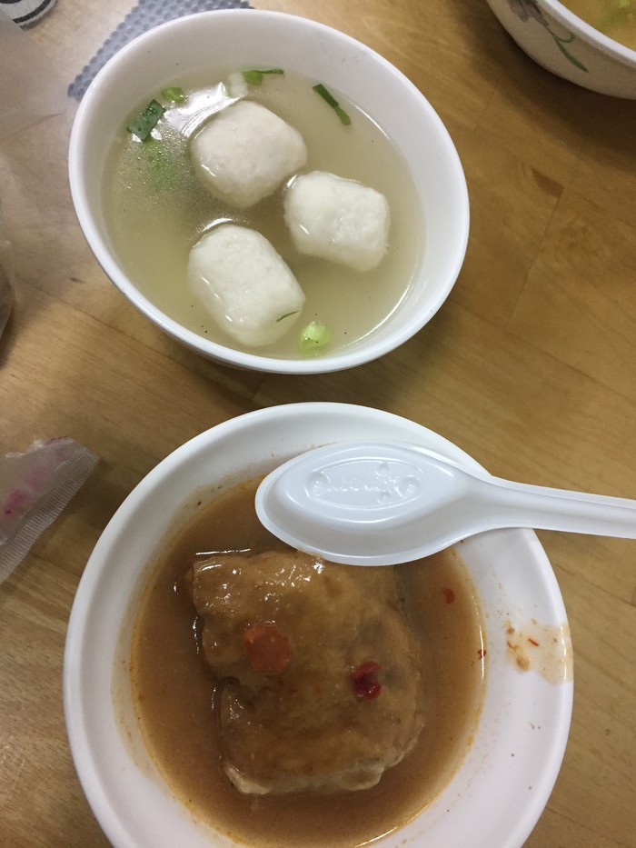 此时此刻,我的肚子早已膨胀,但是凭着对美食的执着,美食的欲望,我也得尝尝这淡水老街最为出名的小食------淡水阿给。开始我也在想为什么要叫阿给,这名字好有趣!阿给是日文“油豆腐”发音的直接音译,是将油豆腐的中间挖空,然后填充炒过的冬粉、浸泡过卤汁,以鱼浆封口,加以蒸熟,食用前淋上甜辣酱。阿给的由来,是源自1965年杨郑锦文女士所发明,起初是为了不想浪费卖剩的食材,而想出的特殊料理方式,创始店位于淡水镇真理街上。一份原味阿给35T,一份鱼丸汤30T,吃完一阵满满的满足感。