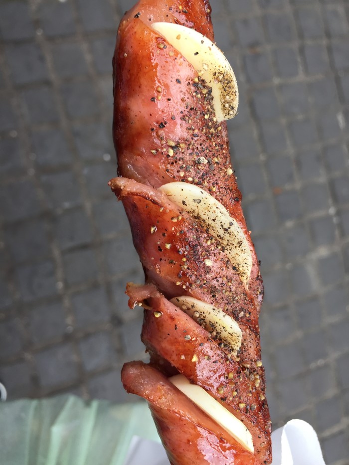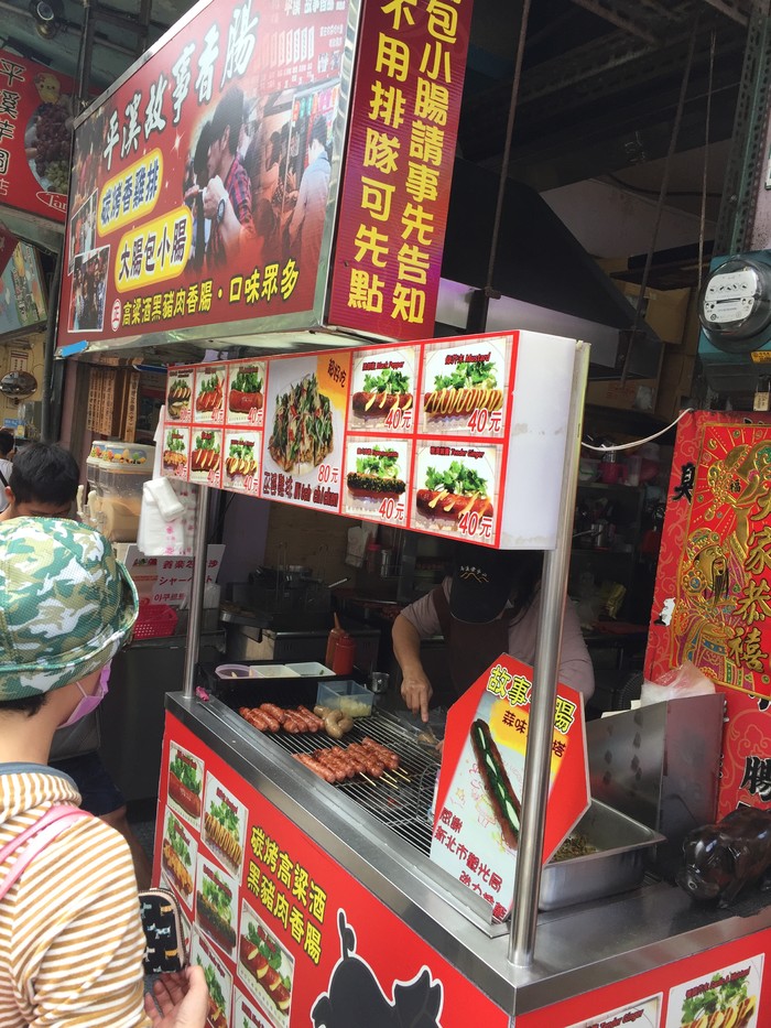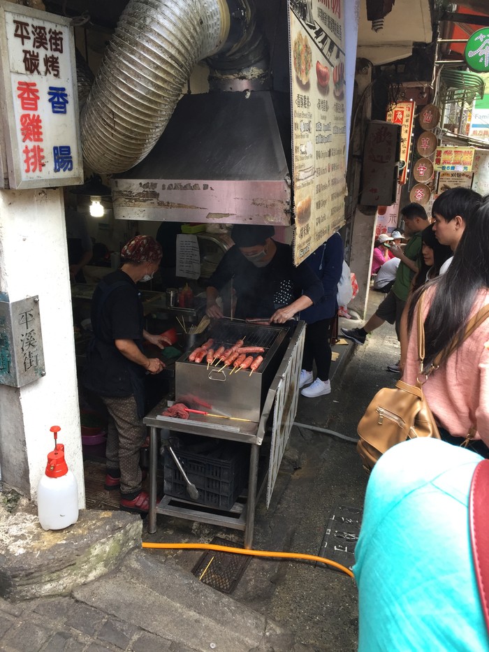 平溪老街最热闹的小食要属烤香肠了,有两家,对立而开,一家是平溪街铁道烤香肠,一家平溪街故事烤香肠。不知道两家烤香肠味道上有什么区别,但是每一家面前无不排着长长的队伍,从街的这一头到街的另一头。吃上一根烤香肠得花半个小时的排队等待时间,一般都是现烤现卖,烤好的香肠中含有浓浓的鲜香味以及淡淡的炭烤味,咬起来肉质新鲜有弹性,其独特的口感掳获了许多美食爱好者的心。此外,若是能接受蒜头味道的话,香肠中可以插入蒜瓣,香肠与蒜头在嘴里产生的特殊香味会叫人爱不释手。