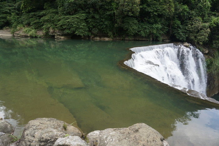 十分瀑布也是区间平溪线的著名景点,地处基隆河上游瀑布群。区间小火车十分站下,然后步行半小时,就能听到瀑布的水声。跟着水声前行,展现面前的是一潭碧水,水面平静,清澈见底。对于没有见过“正规”瀑布的我,内心还是有点小激动的。