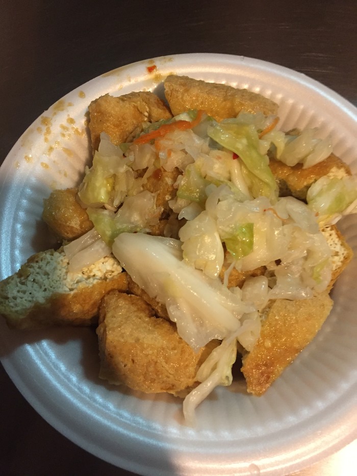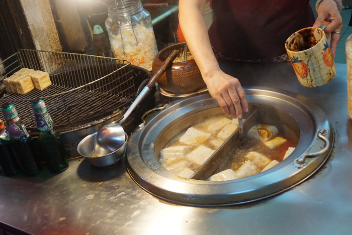 台湾的臭豆腐其外表面酥脆,里面则有很多孔洞,外面臭里面也臭。台湾臭豆腐还要配上专门的泡菜,泡菜是采用圆白菜淹制而成,吃起来爽脆,酸酸甜甜的。