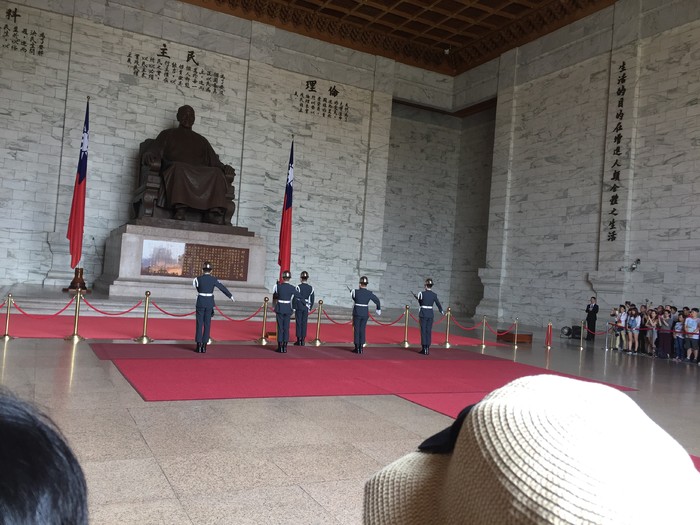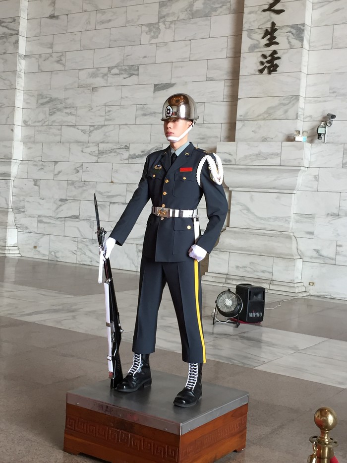 蒋介石铜像前方左右有2个礼兵守卫像一座雕塑一样庄严,为中华民国国军三军仪队,每小时执行一次卫兵交接仪式,成为台北观光的重要景观。