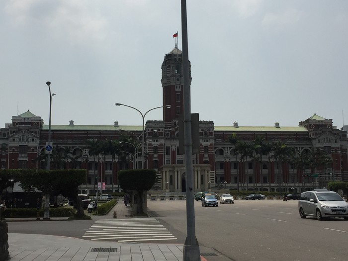从中正纪念堂可以步行至总统府。沿途看见了台湾一些工会在总统府门口游行,照片就不上了,毕竟民主与自由,哈哈。台北总统府位于中国台湾地区台北市的博爱特区,在台湾日据时期启用,当时做为台湾总督府办公厅舍之用,建筑风格为巴洛克式建筑,于1919年完工以后,就一直是中国台湾地区的最高权力中心所在,此建筑也是台湾地区行政当局所谓文化部所指定的古迹 。总统府门口可以通行,但是不能坐。