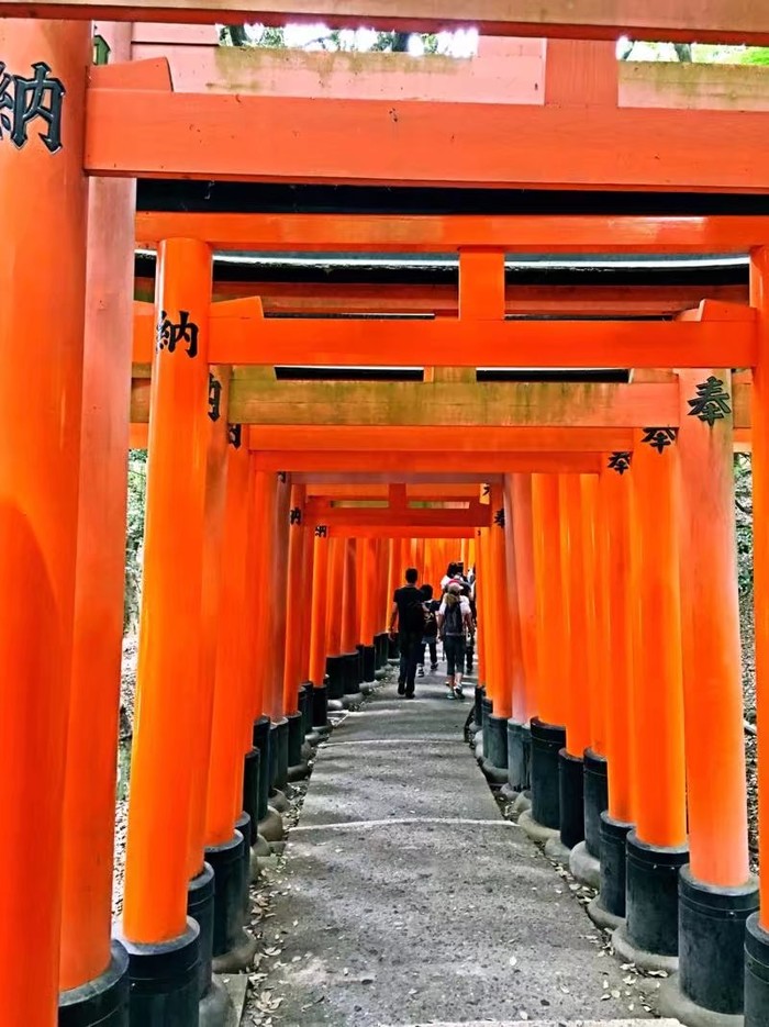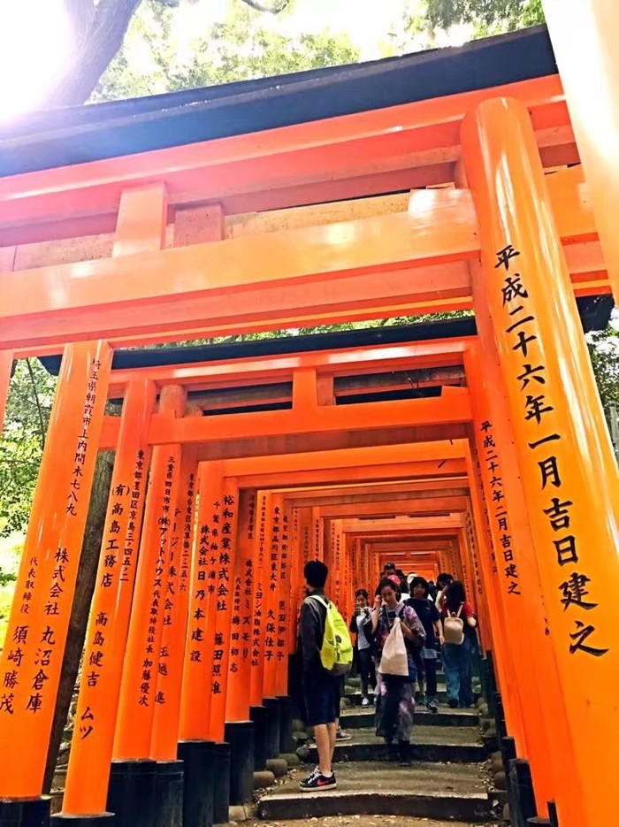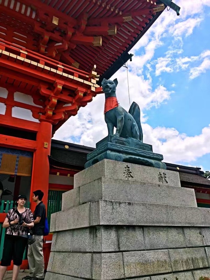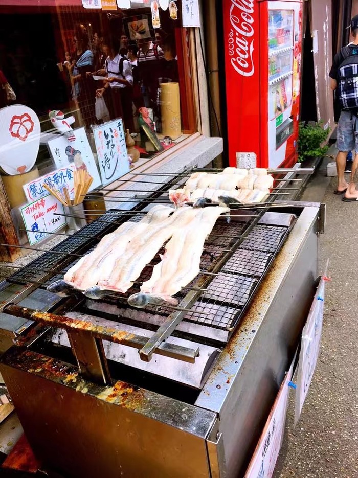 冈本出来后,我们坐地铁到了伏见稻荷大社,就是为了看一眼千鸟居以及品尝下好吃的鳗鱼饭,我们到的时候已经差不多中午了,景点非常有名,到那边就感觉满眼的人、从、众。(顺便说一下,这次我们出行,几乎每天都碰到日本下至幼稚园大至高中生的课外教学、毕业旅行、春游之类的,几乎每天在我们去的景点都能碰到日本熊孩子)我们穿着和服,爬着楼梯,向千鸟居行去,由于人多,我们又穿着和服,天气也热,我们就没有爬很高,到一半就下来了,然后逃也似的离开的那边,去著名的祢さめ家吃鳗鱼饭,店面不大,鳗鱼都是店门口现烤的,东西真心好吃,我这个不吃米饭的人,把米饭全部吃光了(后面几天的行程,我也几乎是把米饭全部吃完的)
