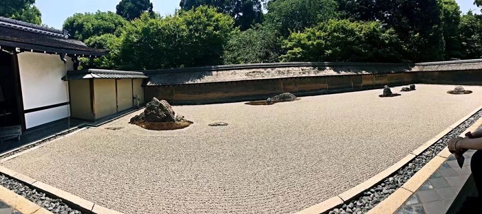 今天原先计划是先去三十三间堂然后再去金阁寺的,后来想想三十三间堂比较近,就选择了先去金阁寺,这也是一个著名的景点,当地叫鹿苑寺,因为寺里面有个金阁,因此又叫金阁寺,还是一样,著名景点肯定是人从众外加日本娃的课外教学、春游、毕业旅行,我们拍了下金阁,在茶肆坐下喝了个茶吃了个点心就出来了,然后坐车去了龙安寺,龙安寺因为不是跟团游必去景点,虽然两个寺庙就是隔壁的关系,龙安寺人明显少了很多,龙安寺最出名的就是他们寺内的枯水庭院和两个龙屏风,这次只看到了枯水庭院,龙屏风收起来了,没见到真容,有点可惜。