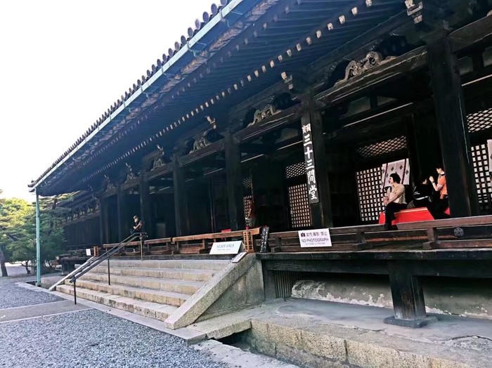 吃完寿司出来,我们又坐车赶往了三十三间堂,去看看日本国宝,三十三间堂里面供奉着1001尊千手观音像,进去礼佛参拜都特别的安静,里面可是禁止拍照的。(期间我的手机突然响了,是母上大人来电,当时就觉得铃声特别突兀,打扰到了殿内的宁静,真心对不起)京都很多寺庙里面,进去都是要脱鞋的,赤脚踩在木质地板上的感觉真的很美好~~~~~~