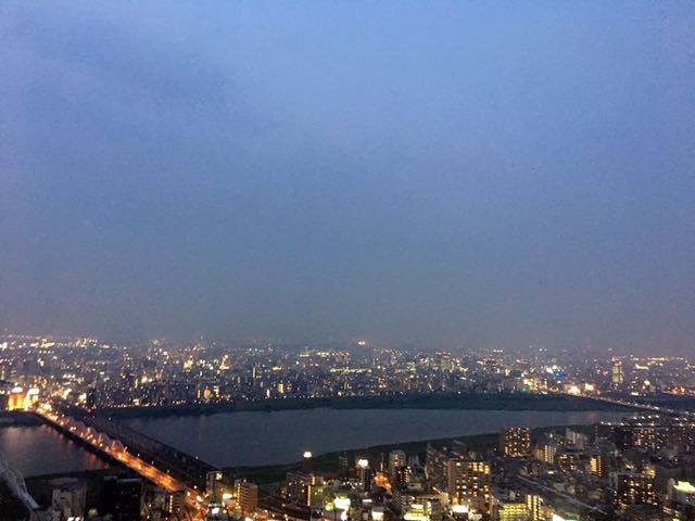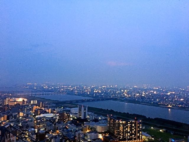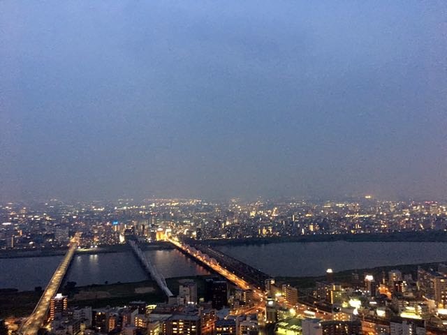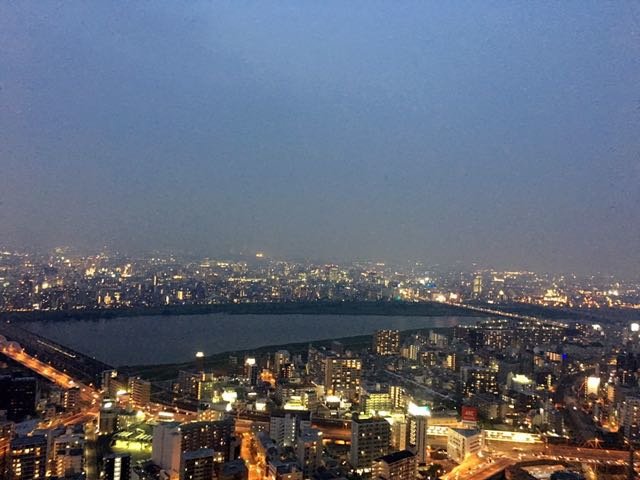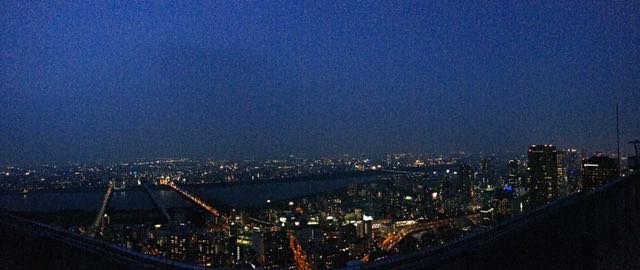 梅田蓝天大厦空中庭院离hep five摩天轮还有点距离,我们跟着人流慢慢走过去,感觉我们属于比较幸运的,在天刚黑的时候到了那边,坐电梯上去了,在上面呆坐到天完全黑下来的,下来时候外面已经排起了长长的队伍,原来大家都是吃完晚饭,来这边看夜景的,还好我们不是这个想法,不然排队排死,可能到大楼下面看见那么多人,我们就打道回府了。