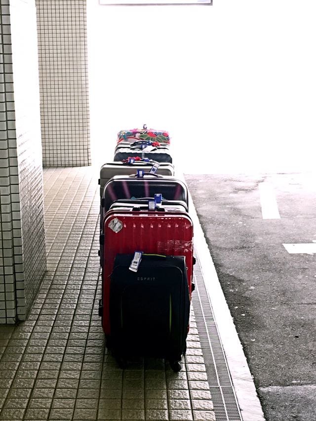 等待机场大巴,工作人员连箱子都摆放那么整齐