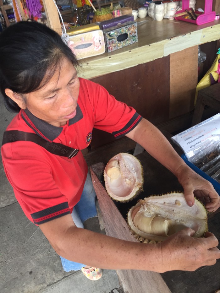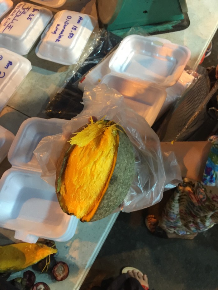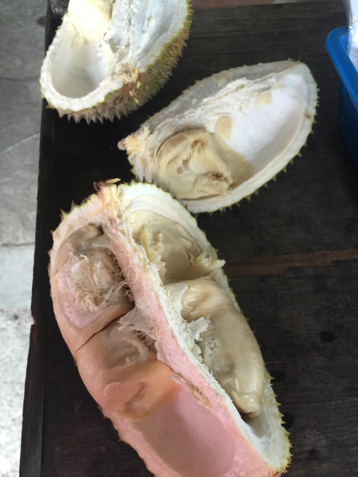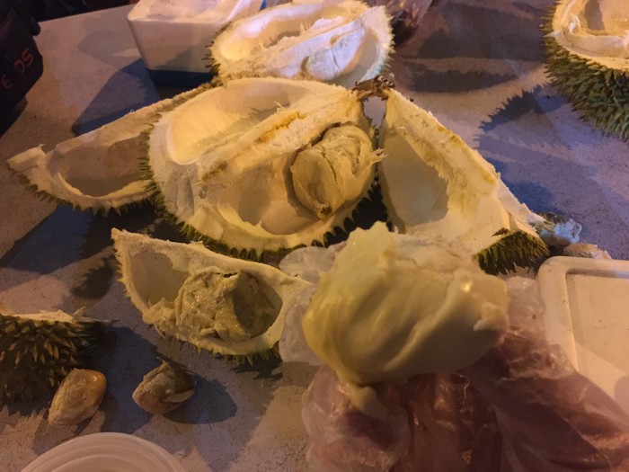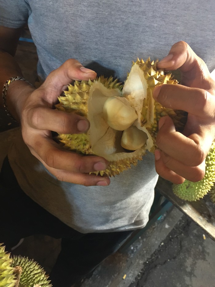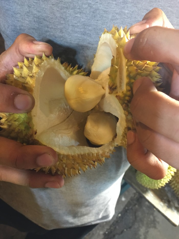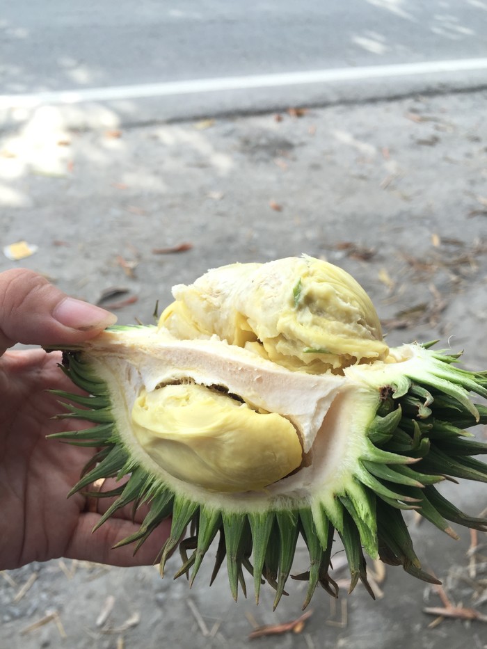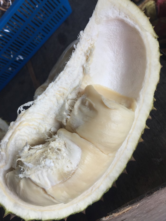 从已经拨出肉的榴莲中可以看出,这边果肉的颜色基本都比较深,还有种比较橘色的!叫葫芦,算一个中端品种吧,不过这些都算质量差了,现场已经没有葫芦了,在老板的建议下,我们开了一个坤宝,25rm一千克,味道浓郁,层次感强烈,有淡淡的岩浆味,老头这么说,以我的感受来说是有点矿物质的味道,一点点的苦味,吃起来反而不那么腻,纤维感少,颜色偏深,偏橘,对口对口,这种感受不是泰国金枕头能给的!