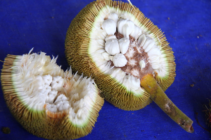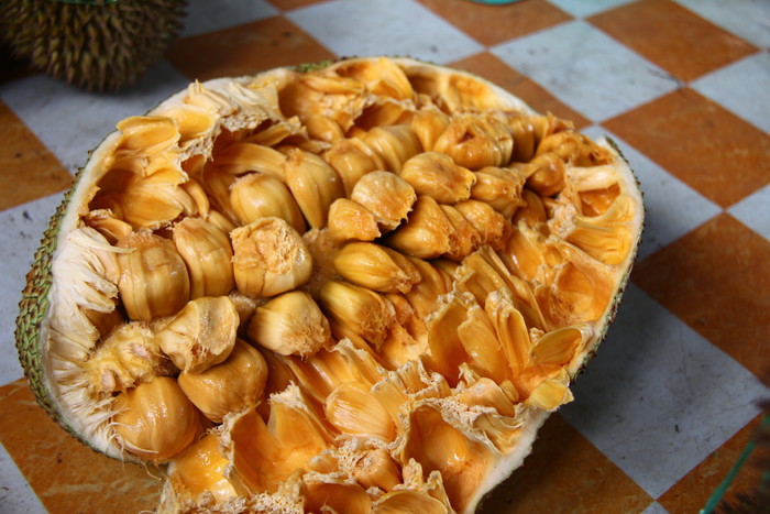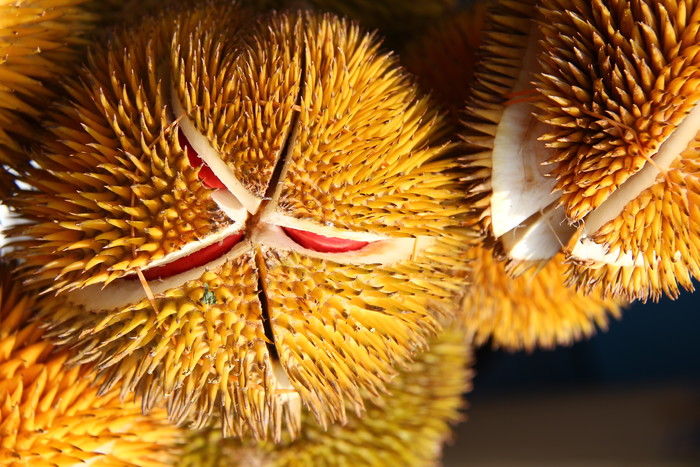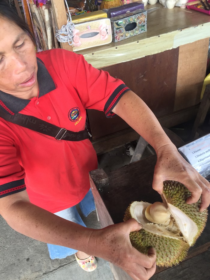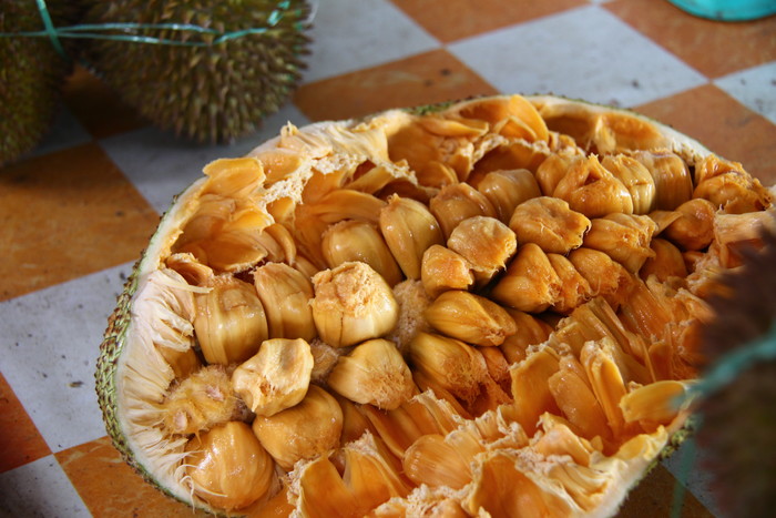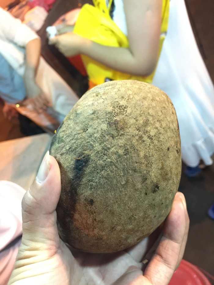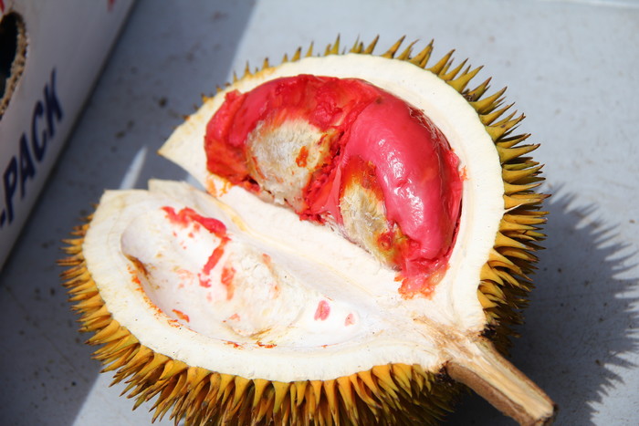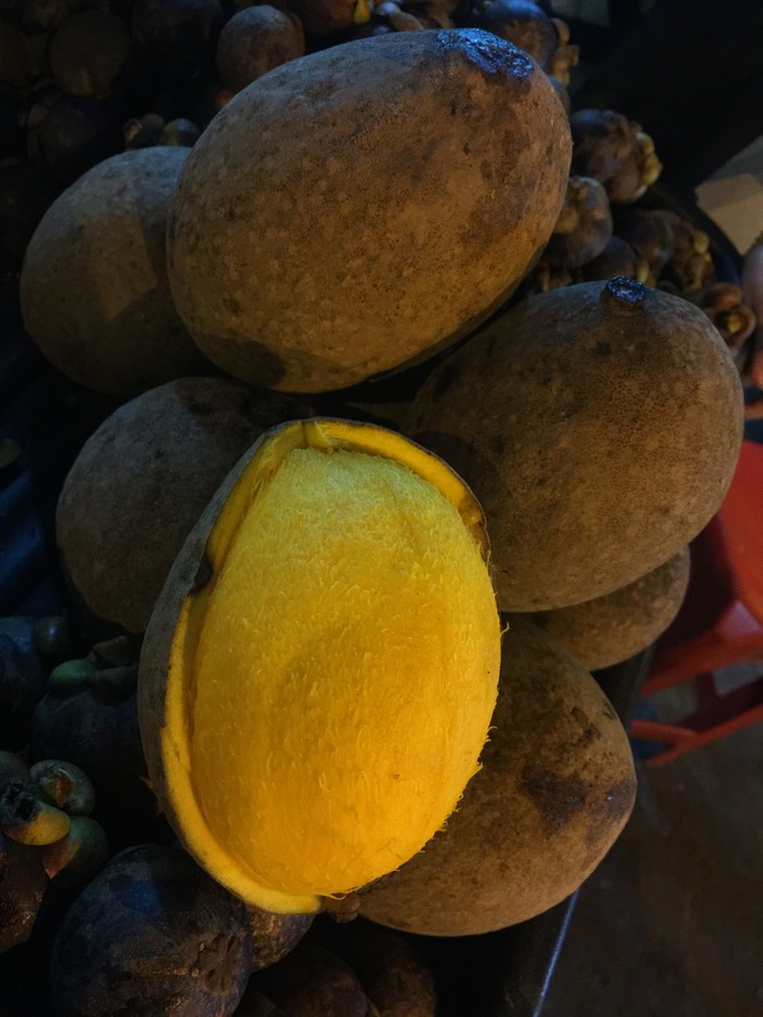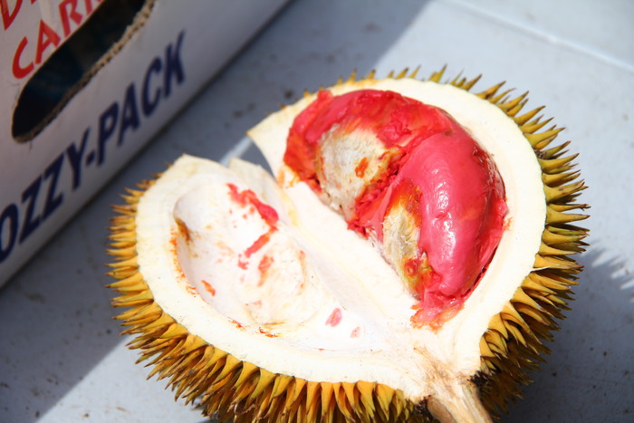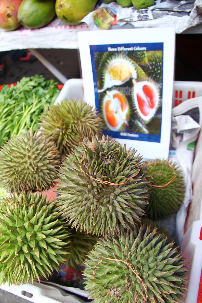 从已经拨出肉的榴莲中可以看出,这边果肉的颜色基本都比较深,还有种比较橘色的!叫葫芦,算一个中端品种吧,不过这些都算质量差了,现场已经没有葫芦了,在老板的建议下,我们开了一个坤宝,25rm一千克,味道浓郁,层次感强烈,有淡淡的岩浆味,老头这么说,以我的感受来说是有点矿物质的味道,一点点的苦味,吃起来反而不那么腻,纤维感少,颜色偏深,偏橘,对口对口,这种感受不是泰国金枕头能给的!
