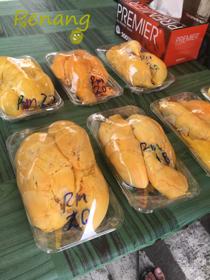 苏丹王,国内也算比较知名的榴莲,相比较猫山王而言,甜度有些增加,但是细腻程度和口感的复合程度远不及猫山王,在这里是38rm一千克,在国内有挺多的苏丹王果肉冻干,用在很多的榴莲甜品上。