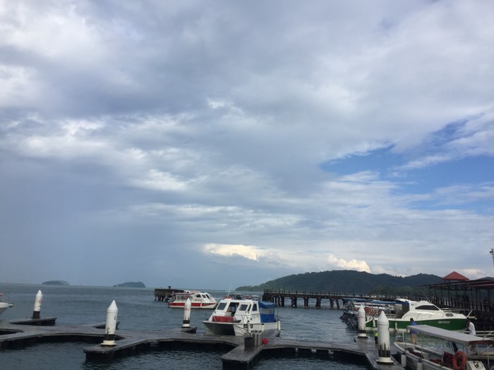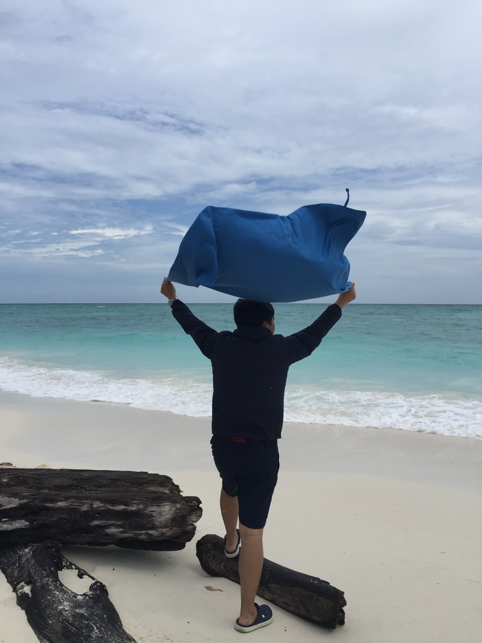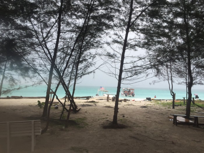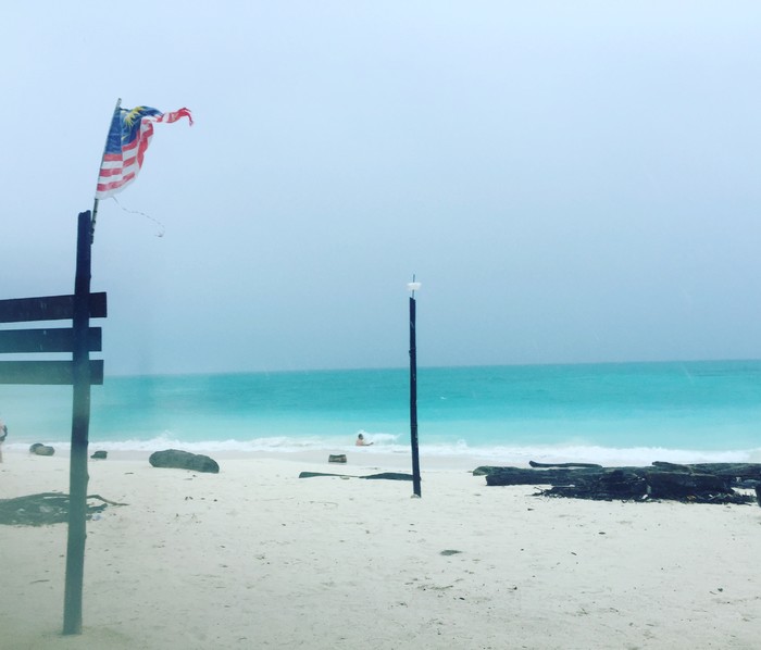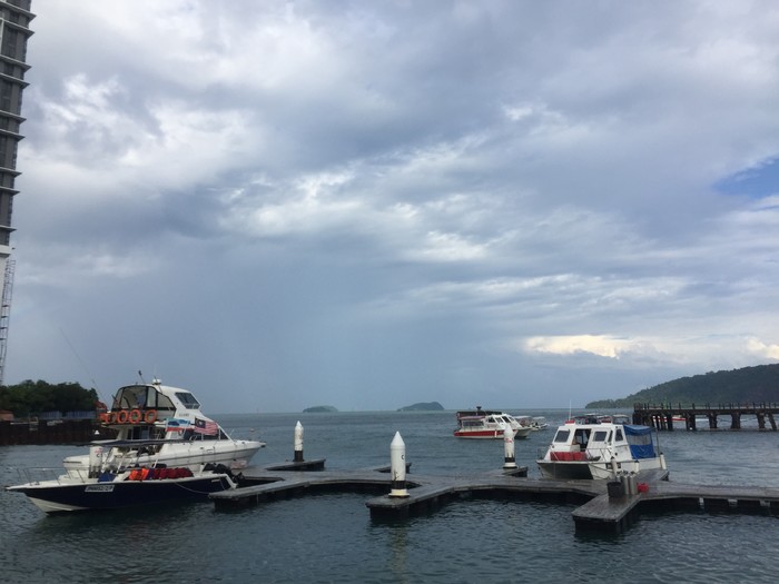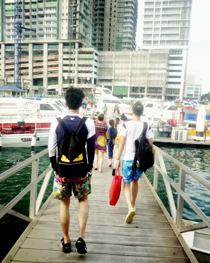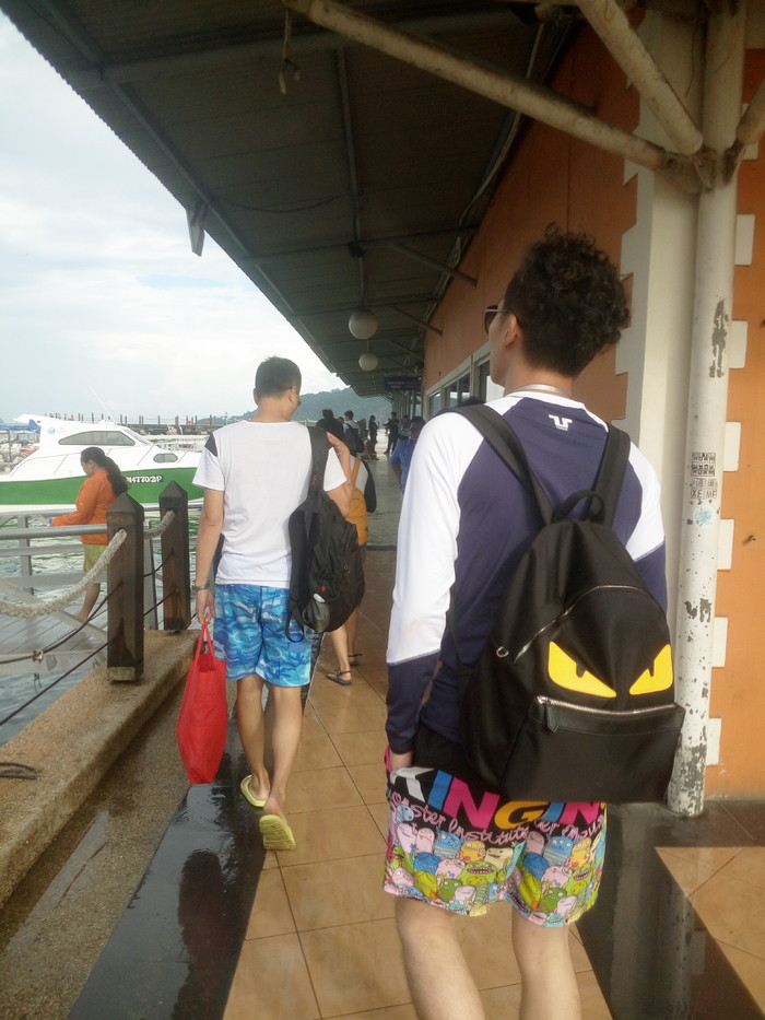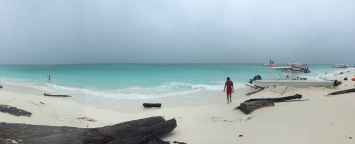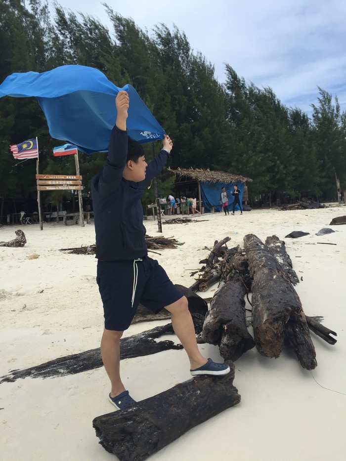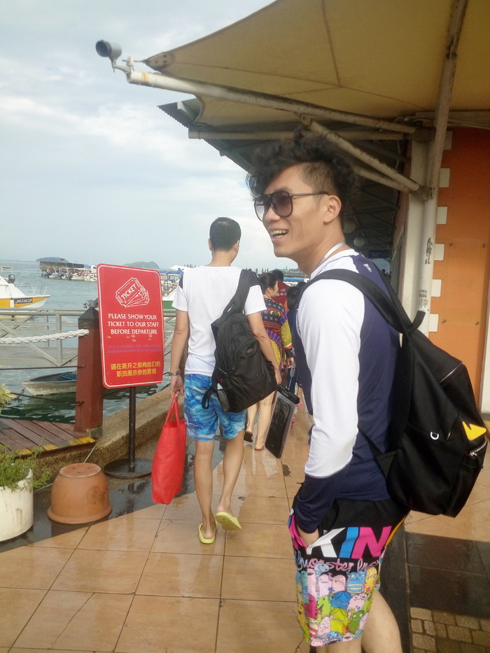 今天起了个大早去出海。海岛的确去了不少,但是今天非常特别,因为对于环滩岛非常仰慕,主要还是因为看了xfun的航拍画面,对于那近乎马代的海水痴迷万分,所以淘汰了美人鱼岛,坚决转战环滩,虽然环滩的价格稍微还贵一点。给大家科个普,环滩属于私人岛屿,近两年才开放,而且对于亚庇来说还算不远,在我们下塌的gaya centre hotel过去码头只要十几分钟,然后理论上坐一小时的船差不多就到了。而对比跋山涉水的美人鱼岛,一来路途遥远,半天的路程,加上被众多游客污染的环境,显得不是非常的有逼格~~哈哈。再来说说这个环滩岛,因为是个私人岛屿,所以岛上的公共设施并不是非常的全面,基本只有一处完善的码头和休闲区,包给一家指定的旅游公司运营,所以一日游的价格非常坚挺,在500以上,想想这个价格在越南可是能做好几次深潜了哦!如果只为了看环滩,对于辅助服务不是很在意的话,可以选择非直接授权的旅游公司,一日浮潜游价格在400以内,区别在于,你不能在主码头登录,要在环滩岛其他海滩登录,然后中饭就是他们自带的海滩BBQ了,也算挺有一番风味的!当然,我选的是后者。哈哈。可惜天公不作美,一起床,妈的天就下起了大雨