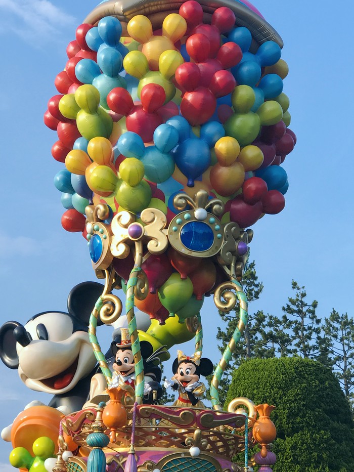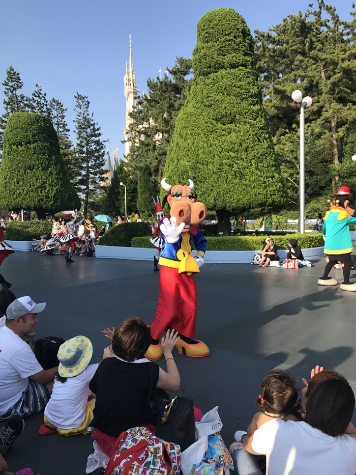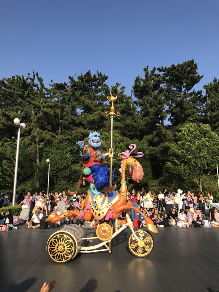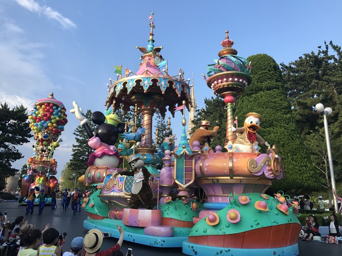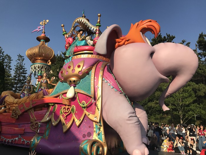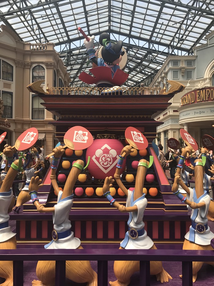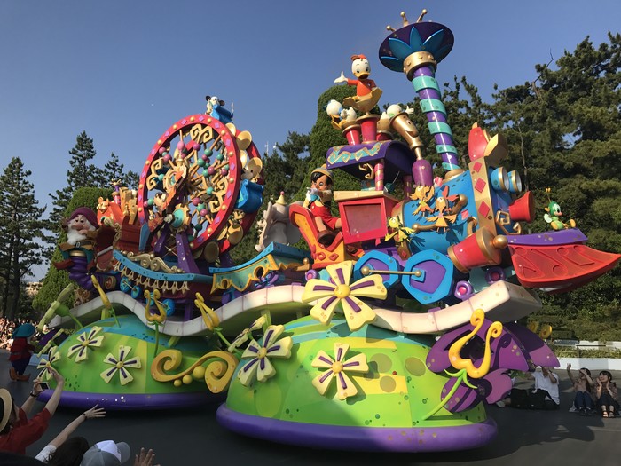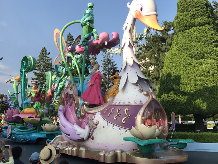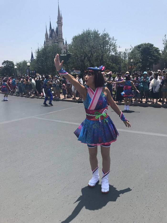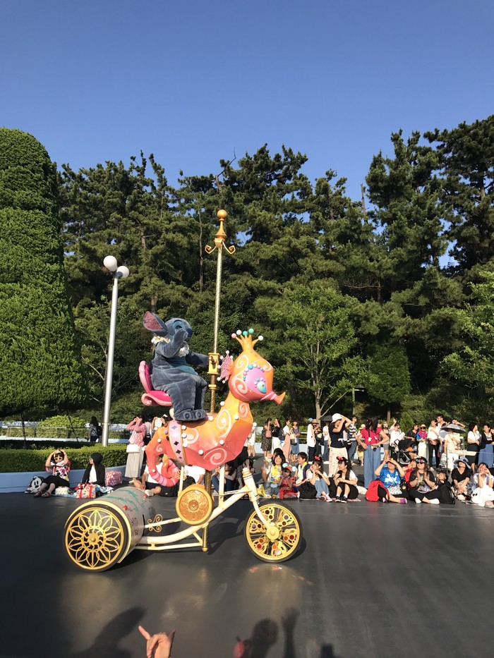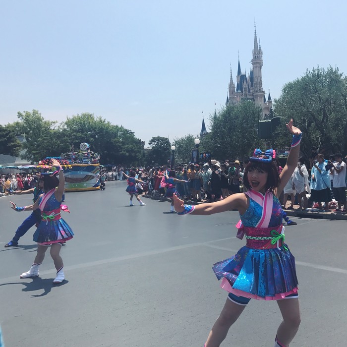 园内的设施我们一个个玩过来,没有拿fast pass,基本排队十分钟以内能玩到。正当想找个餐厅填肚子的时候,听到城堡那边传来欢呼声。将近中午十二点,第一轮和风夏庆特别游行开始了。我看到其他游客都是有备而来,有的穿着雨衣,有的摄像机镜头套着防水罩。原来花车上的工作人员会拿水枪向人群喷洒水柱,所到之处激起一片尖叫,不想湿身的我拍了几张照片赶紧撤了。和风夏庆每天中午十二点和下午两点各有一场。