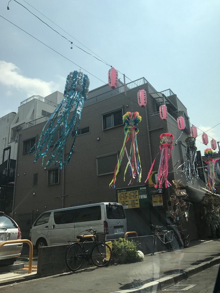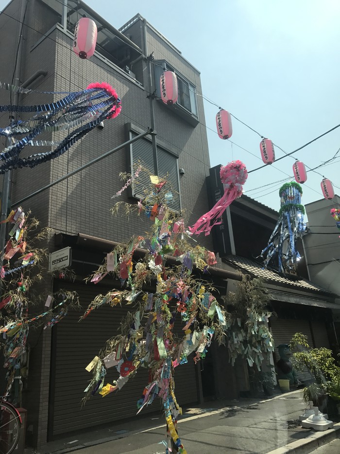 路边挂的是七夕祭的节日装饰。日本人过的是新历7月7日,在五颜六色的长条诗笺上写下愿望和诗歌,连同用纸做的装饰品一起挂在小竹子上,Emoji里就有专属的表情符号 。日本的七夕不是祈求爱情,而是请求织女星保佑自家女孩的书法、裁衣等手艺能有所进步。