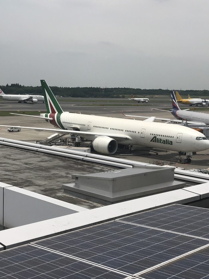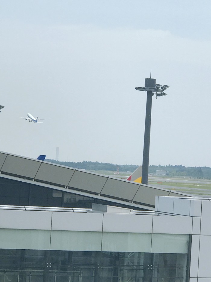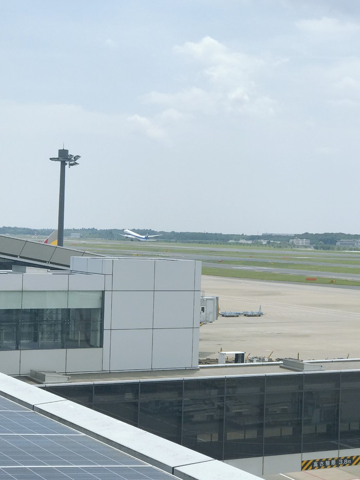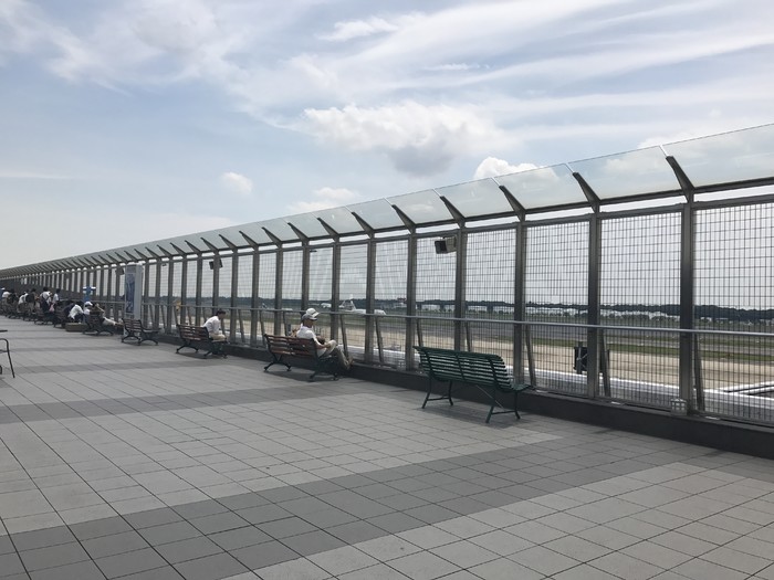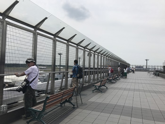 不二家旁的foodcourt往室外露台走,是一个很大的观景平台,可以看到飞机起降,不少人拿着专业的相机在拍。防护网的中间有一个ipad mini那么大的镂空处可以让游客把相机伸出去拍照,还是挺贴心的。