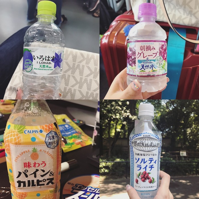 另外,这么热的天气来日本,如果不想喝矿泉水,可以买下图这种,橙色的是乳酸菌饮料可尔必思,另外三种是加了10%的果汁的矿泉水,既解渴又好喝。