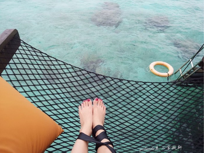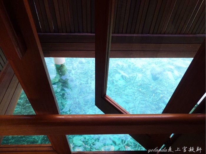 相比沙屋更爱水屋,出门就是栈桥,一大片绿色尽收眼底,如果想要浮潜,自己从房间"爬"进海里就可以了。