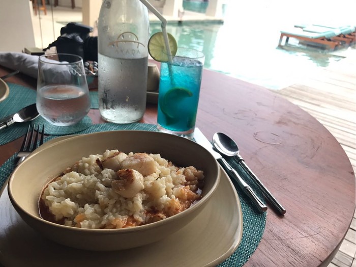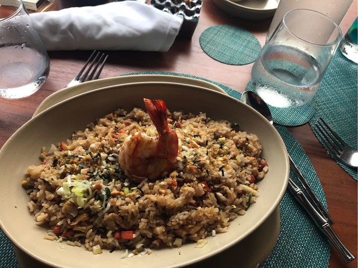 上岛第一天已经将近中午了,在零度酒吧吃了顿午餐,两人点了海鲜炒饭、烩饭之类的和两杯鸡尾酒,加上服务费大概700多RMB,其他时候很少吃午饭,一是因为中午太阳真的很大,不太想出去,二是早餐十点半才结束,真的不饿。