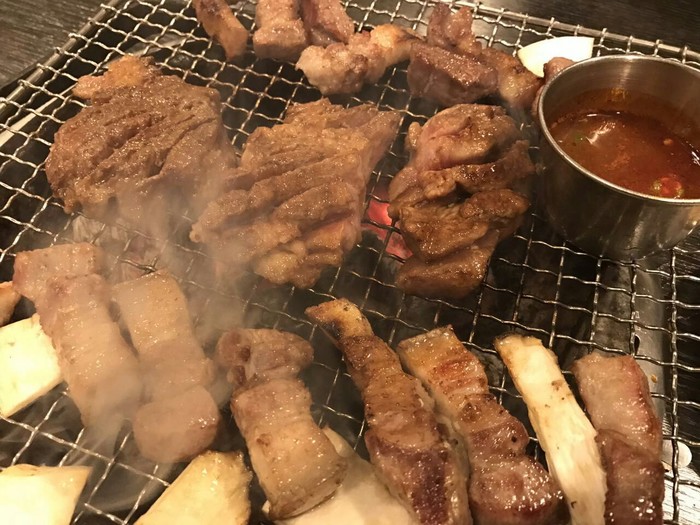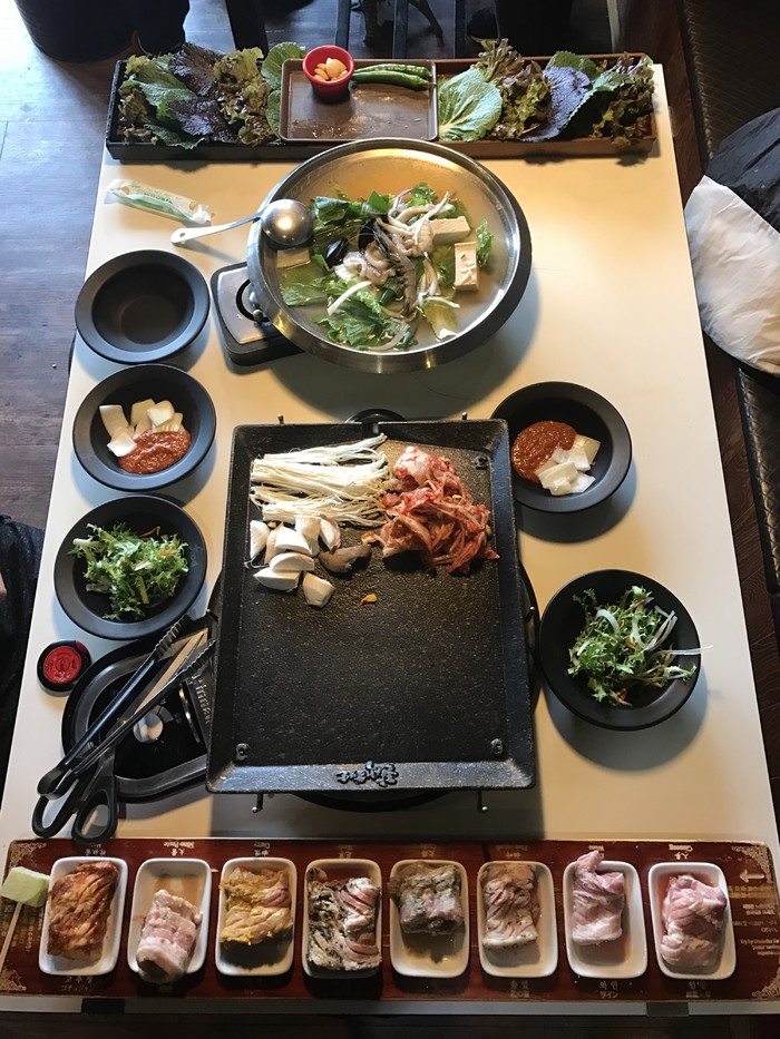 因为喜欢看杜如风,所以第一站吃的就是明洞的黑豚(人均80rmb)[地铁四号线明洞站6号出口,黑色那里负一层就是,招牌好像写着从济州岛来的黑豚] 点了五花肉、腌制和无腌制的黑豚肉,超好吃的,特别是猪皮(肉隔壁黄色两条),猪皮不能单点,但是老板娘看我们是特意来的又送了两条,超好人,还教我们吃法,不同其他店的吃法,有好几个酱要沾(菜-麻叶-蒜头-黄瓜+肉沾铁罐酱--沾洋葱碗内的酱--茶色的酱--包在一起),给的沙拉也很好吃。老板会帮忙烤的不用自己动手。可以续添生菜(麻叶没有给我们续添,麻叶好吃), 我跟我姐觉得还是腌制过的肉比较好吃