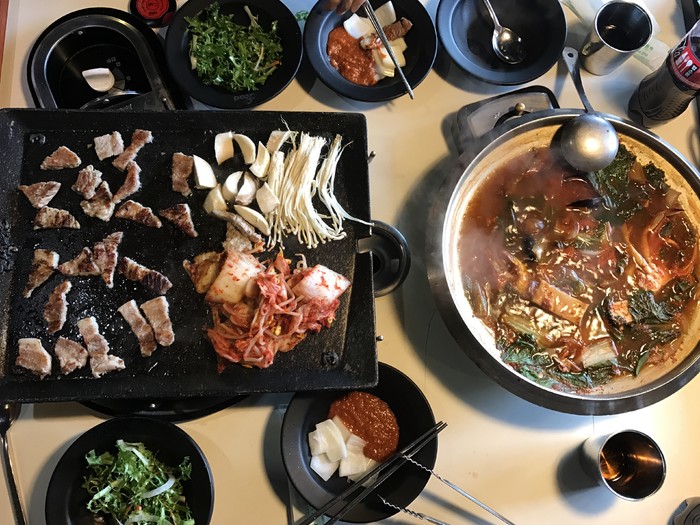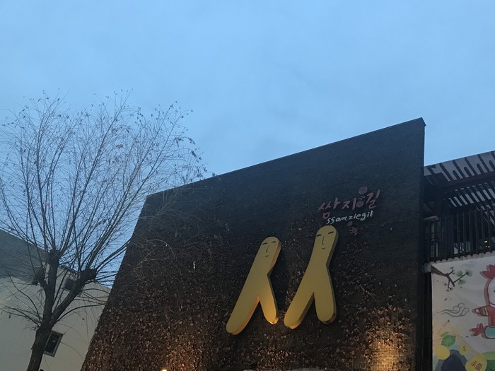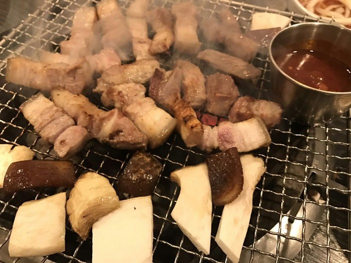 下午等她回来在东大门附近吃了八色烤肉(人均106rmb),是腌制的猪肉,送的海鲜大酱汤,蛮多游客去得,嗯,不好吃,不推荐,这趟旅行唯一不好的吃的。汤吃完还可以叫店员弄成汤饭,我们的没有喝汤,汤到后来好辣,只吃海鲜,点肉的酱也辣。八色其实烤到最后都分不出什么味道。
