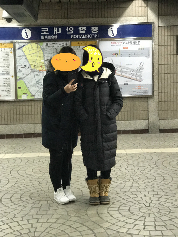 去的时候是冬天,还下小雪,去过的朋友建议带点暖宝宝,可是穿够衣服基本不要用,后来才知道暖宝宝是给机器用的,太冷苹果和相机会关机,安卓倒没事(街上我跟我姐裹得厚厚的,一看就是南方来的孩子,韩国女生居然还有光腿的!! 后来去汗蒸看到她们其实也是贴了很多暖宝宝的,基本从服饰可以看出是哪国人,裹厚厚的肯定是国人,皮鞋+袜裤的基本是樱花妹,完全不怕冷的光腿或穿超薄的+球鞋是韩国妹子)