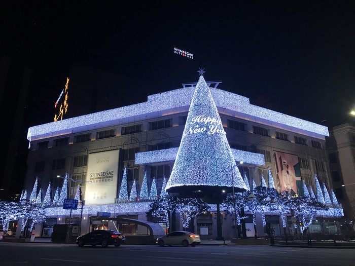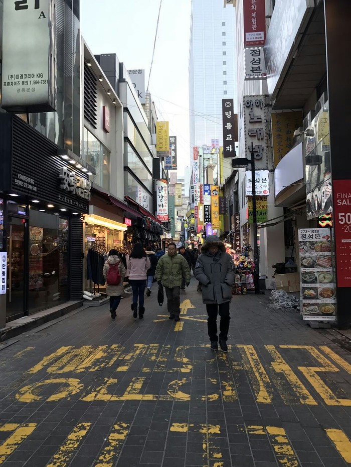 经过明洞圣堂(因为没带sd卡,教堂往上走有个超市可以买,门口还卖现做蛋糕,看到有不少韩国人买,也买了点回去当早餐,味道还可以,人均20rmb),那是还没放年假,游客不多,街边很多小吃,过年的时候反而不多,榨石榴汁我姐喜欢喝偏酸,其他还行吧,我倒是第一时间买了香蕉牛奶好喝。然后看导航步行过去免税店。免税店挺早关门的,所以注意时间,免税店在楼上的,看指示牌,也有中文导购员,免税店很多店员都会中文的,在免税店买的东西是上机场才拿,要现用的可以去楼下的百货商场里买,百货商场买够一定价格也可以退税,有些直接退减在付款金额里,可以问一下店员。