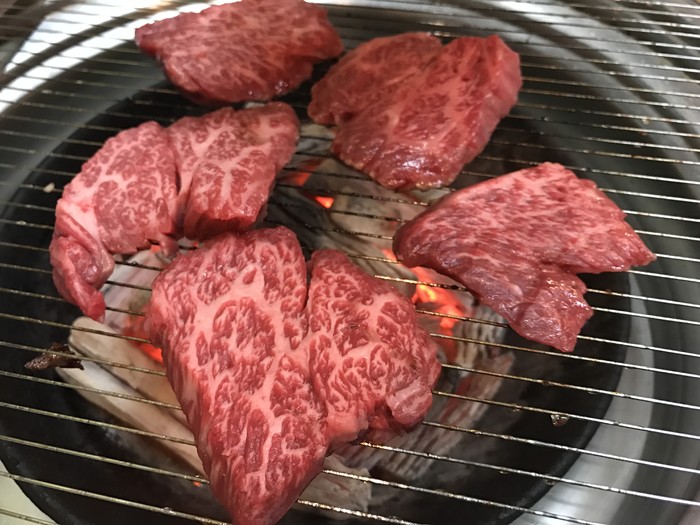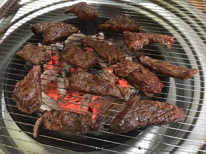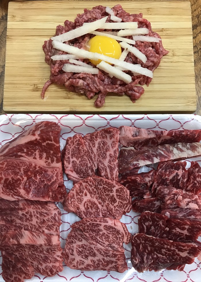 因为快过年很多韩国人也来买牛肉回去过年或者送礼,真的看到旁边的隔间在宰牛(应该是分尸吧),在楼下买牛肉到旁边楼上的店铺里吃,现买现吃加收开炉费50rmb左右,生牛肉(韩牛刺身(牛肉等级A1+~A1+++=5A和牛),叫YUKKE,当时是直接给图他看的,然后他指对应的肉,我们再说要多少克)也要加50rmb左右加工费。