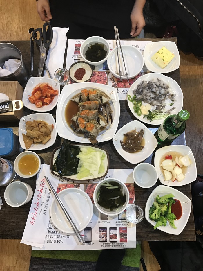 吃完马不停蹄的赶去新沙,怕晚了酱蟹关门,然后发现我们错了,元祖马山安康鱼[瑞草区江南大街99街9号](人均282rmb,忘记是不是把牛肉的也加在里面了)那间居然24小时营业,过年不打烊,还能外带。点了酱蟹、生章鱼和烧酒,送了很多小菜,这里的安康鱼也是出名的,酱蟹吃不了可以点蟹黄拌饭,也是很推荐,也是杜如风节目里面的店,里面还播放流行首尔的片段,店员会中文。
