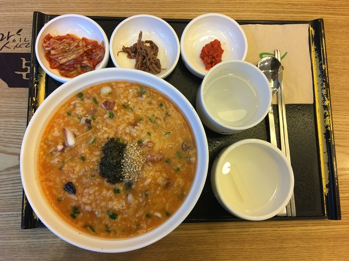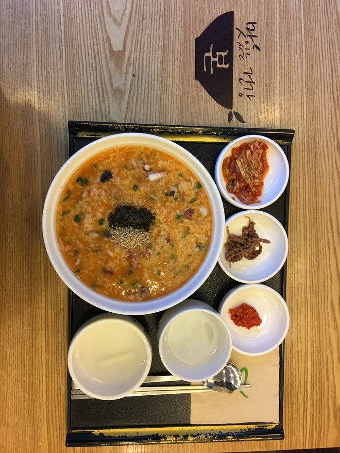 这一天我姐有事,我一整天单独行动,一直在明洞迷路了,朋友比我早几个月前去过,推荐我去Ddaro家牛肉汤饭 ,找了超久都没找到直到遇见小红帽才知道店没了。在路上改吃本粥(人均50rmb)。