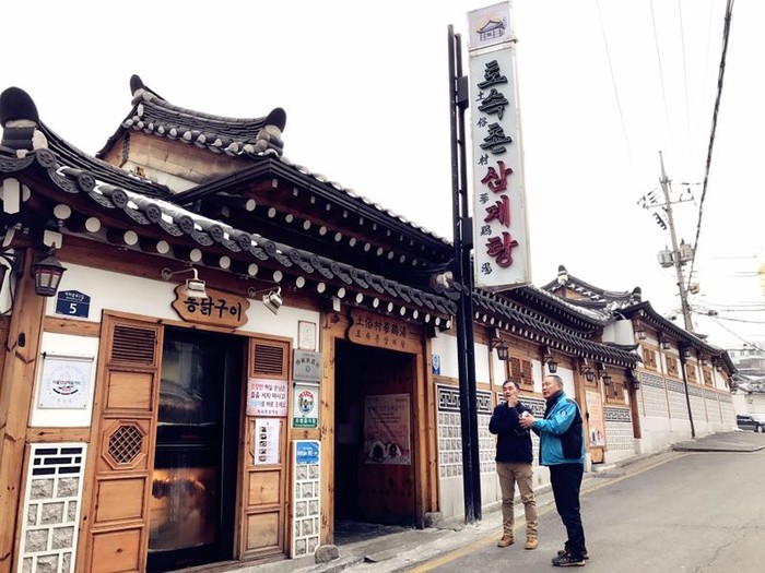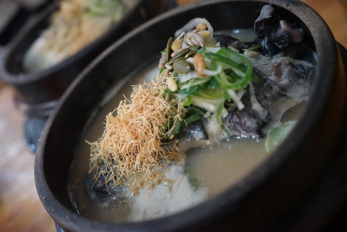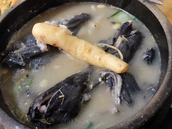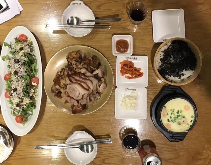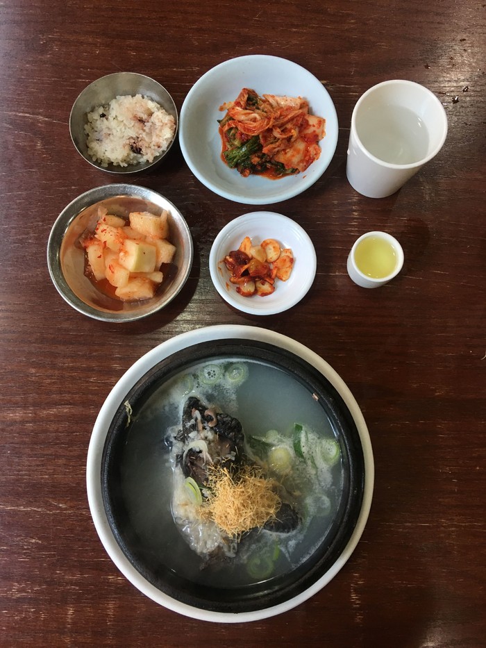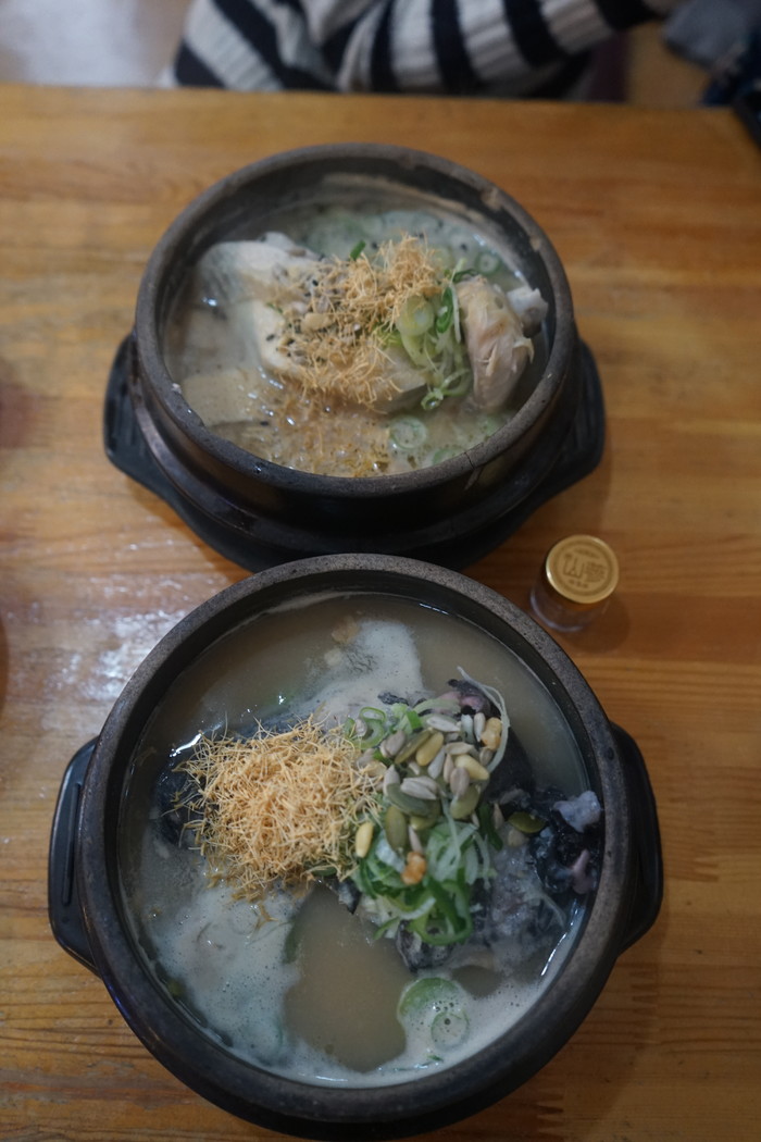 12点就可以看完导航去附近的土俗村参鸡汤(人均193rmb),点了参鸡汤、乌鸡参鸡汤和海鲜饼,挺好吃的,但是一人一个参鸡汤非常饱了(里面有糯米和一些药材),饼没有吃完,还有辣萝卜和泡菜无限供应。小杯的还是人参酒,汤比百济要浓稠,两个不同感觉的,都推荐去试一下。这里是自己撒参丝的,还有完整的人参在鸡内,会给个小碗你放胡椒点鸡肉吃,大碗装骨头的(菜单有教程)。